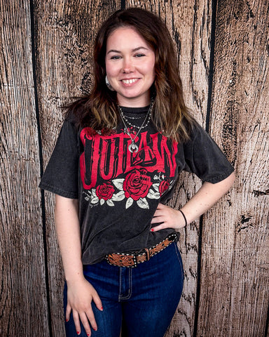 Washed down to the perfect shade of faded black, this vintage-inspired graphic tee brings major edge with a soft side. The oversized red OUTLAW lettering, wrapped in roses, says it all: tough but still feminine, rugged with a romantic streak. It’s that cool-girl energy that doesn’t try too hard—just like your favorite worn-in band tee, only built better.