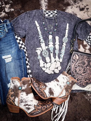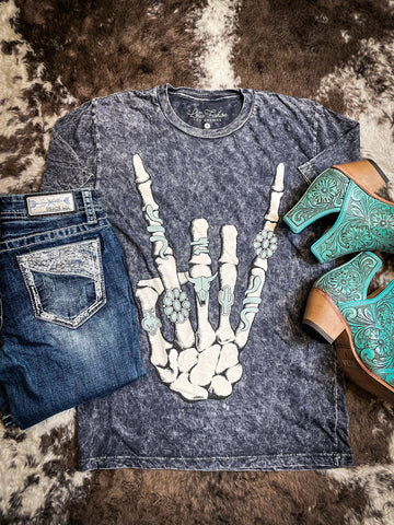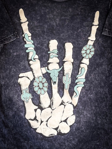 Unleash your rebellious spirit with our Skeleton Rock Hand Sign Tee in Vintage Black. Crafted for comfort and style, this tee boasts a relaxed boyfriend fit and a distinctive mineral wash that lends it a vintage, worn-in appeal. The soft cotton fabric ensures a luxurious feel against your skin, while the bold graphic of a skeleton hand making the rock sign adds a rebellious edge to your look. Whether you're hitting the streets or lounging at home, this tee promises to be your go-to for effortless cool and comfort. Pair with ripped jeans or shorts for a laid-back ensemble that exudes rock 'n' roll attitude.