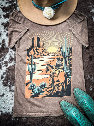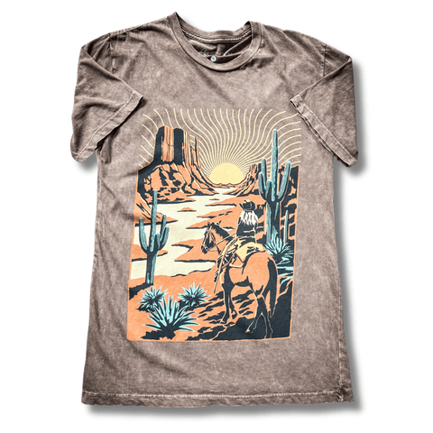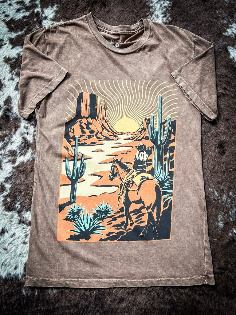 Capture the essence of the frontier with our Western Way Graphic Tee in Mocha. Crafted for comfort and style, this tee features a relaxed boyfriend fit that effortlessly combines laid-back charm with a hint of rugged allure. The rich mocha color adds warmth and versatility to your wardrobe, making it a perfect complement to any casual ensemble. Made from soft, breathable cotton, it ensures a cozy feel all day long, whether you're exploring the outdoors or relaxing at home. The standout graphic pays homage to Western motifs, featuring elements like desert landscapes or cowboy icons that evoke the spirit of the open range. Pair it with your favorite jeans or shorts for a look that embraces timeless Western style with modern comfort.