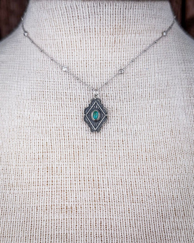 The silver pendant is designed with a diamond-like shape and rounded edges, featuring intricate stamping around the stone. The pattern draws the eye inward, highlighting the turquoise while adding depth and movement to the design. The result is a piece that feels both grounded and delicate—something you can wear day in and day out without ever tiring of its charm.