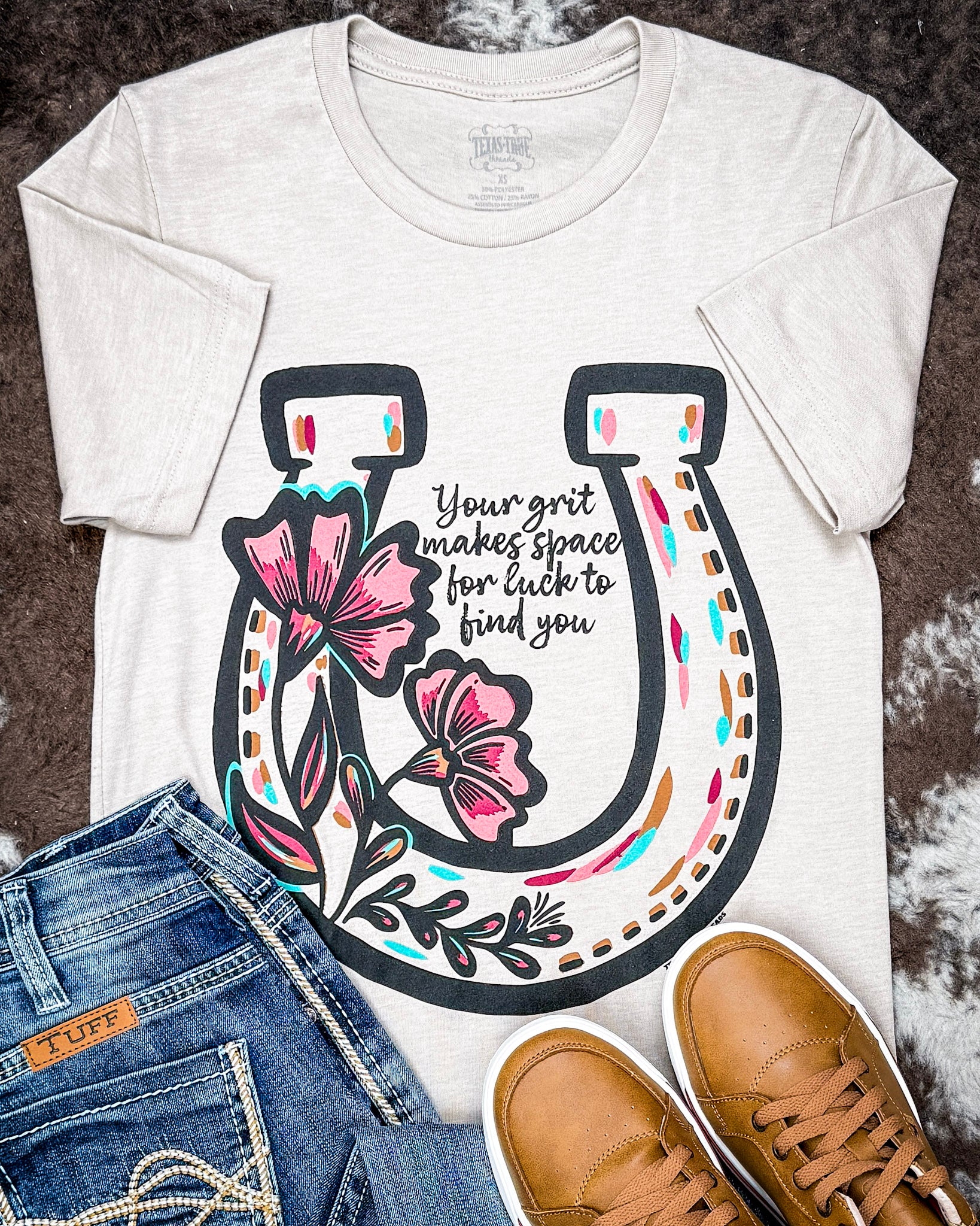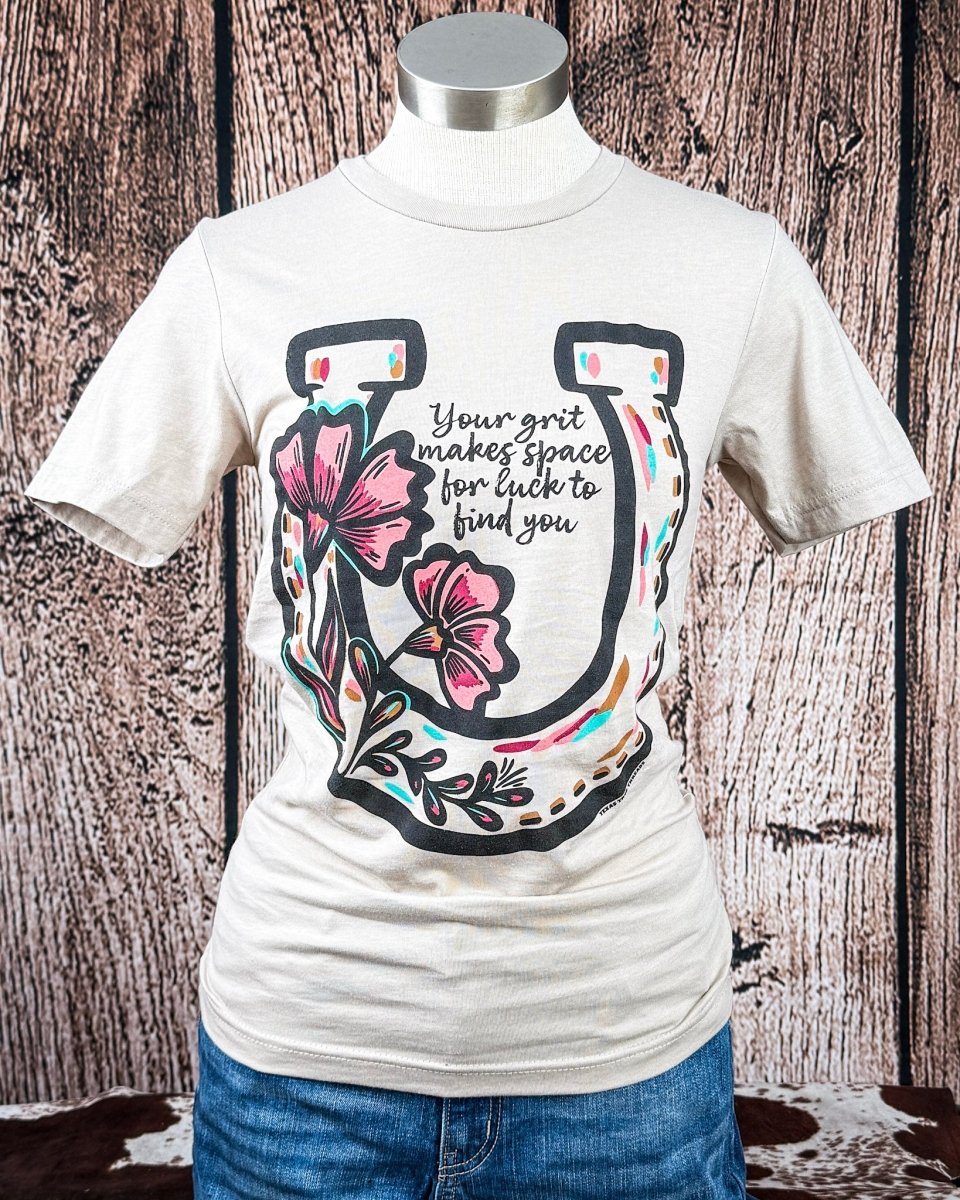 This easygoing graphic tee is made for women who believe effort opens the door for opportunity. The Grit Makes Luck Boyfriend Tee in Natural features a relaxed, lived-in fit with western-inspired artwork and the phrase Your grit makes space for luck to find you. It’s a message that feels grounded, confident, and earned.