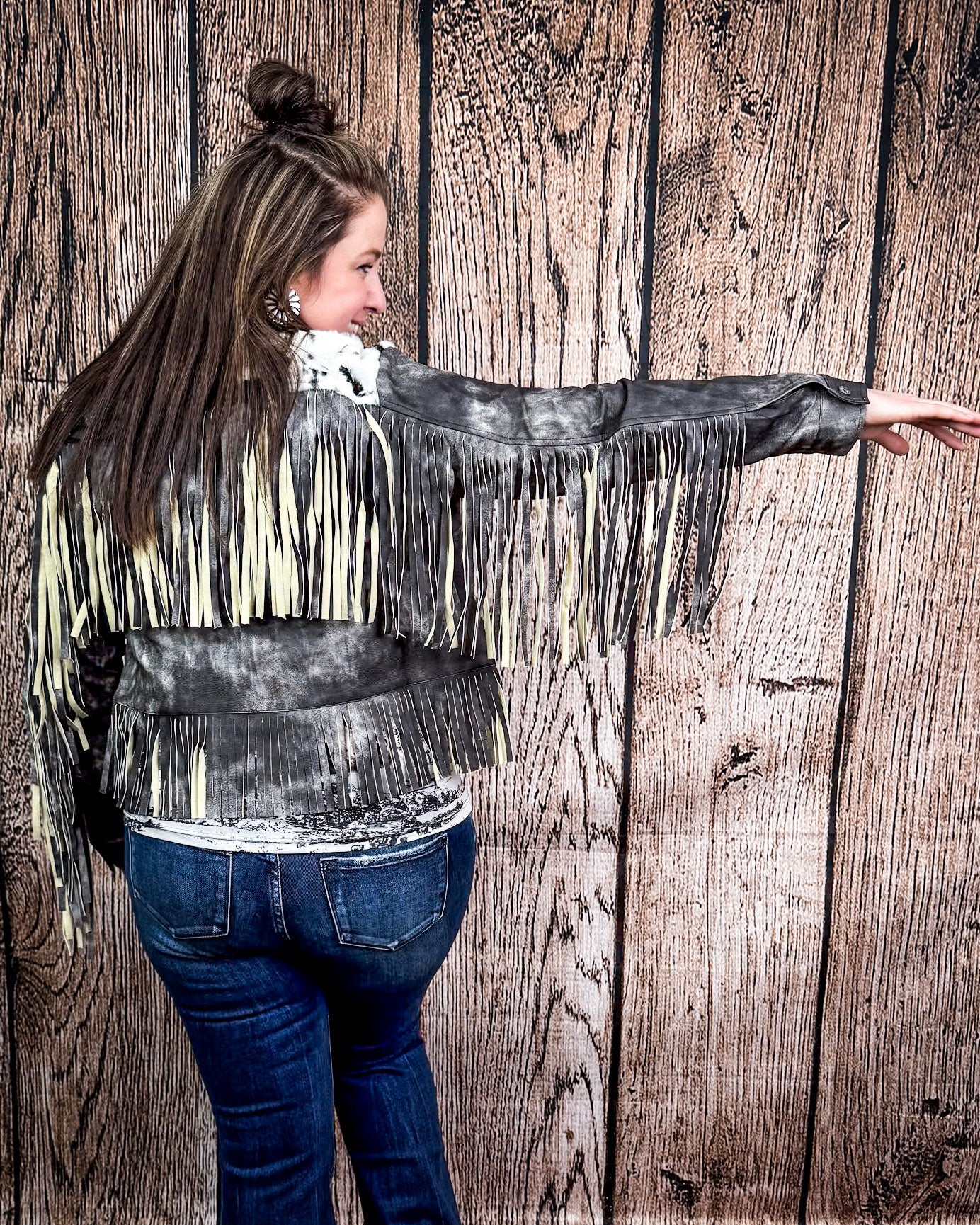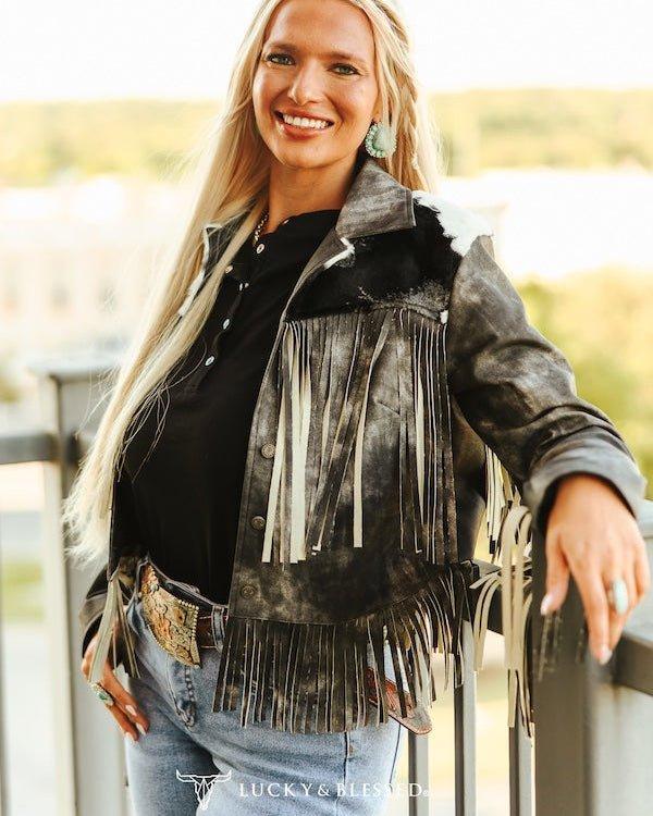 Make your entrance unforgettable in the Midnight Rider Black Vintage Leather Fringe Jacket by Lucky & Blessed. This piece brings the wow factor with every step—crafted from distressed black suede leather and topped off with striking cowhide paneling across the yoke for that true Western edge.