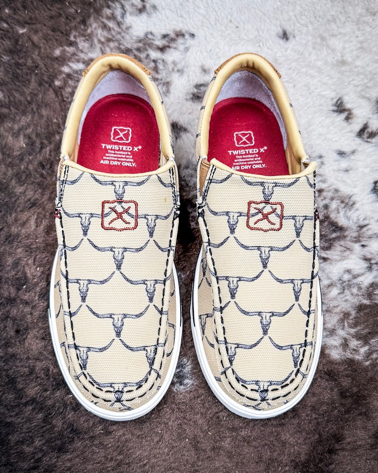 Some shoes are made to blend in. These aren’t those. The Fence Line Slip-On Kicks by Twisted X deliver a fresh take on casual comfort with a pattern that feels right at home in the western lifestyle—graphic, grounded, and just the right kind of bold. With a longhorn print against a warm tan canvas, these kicks capture the quiet charm of open space and long views.
