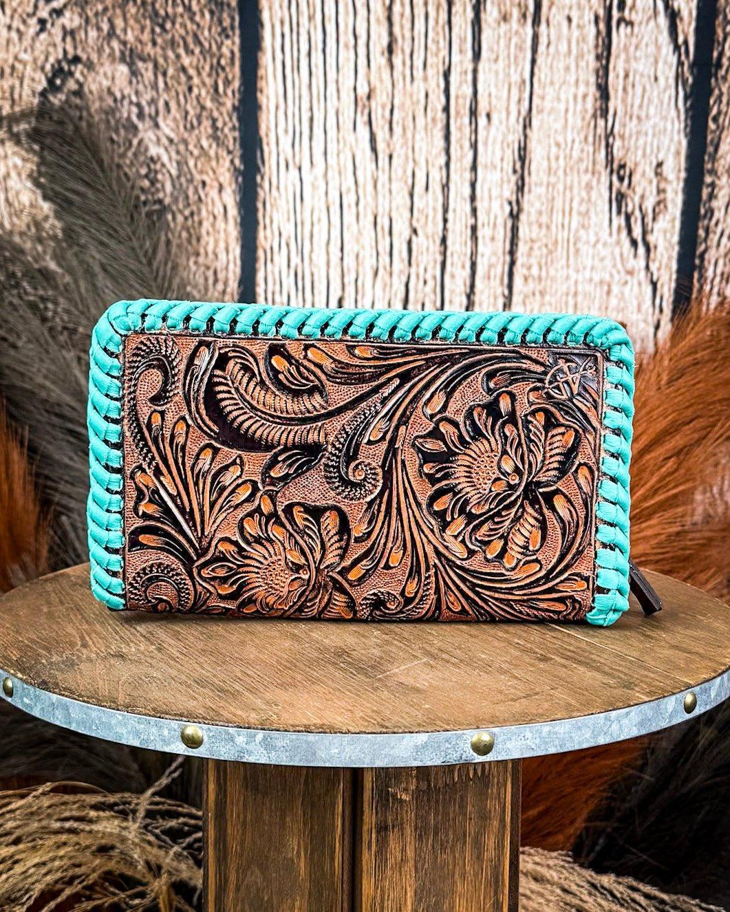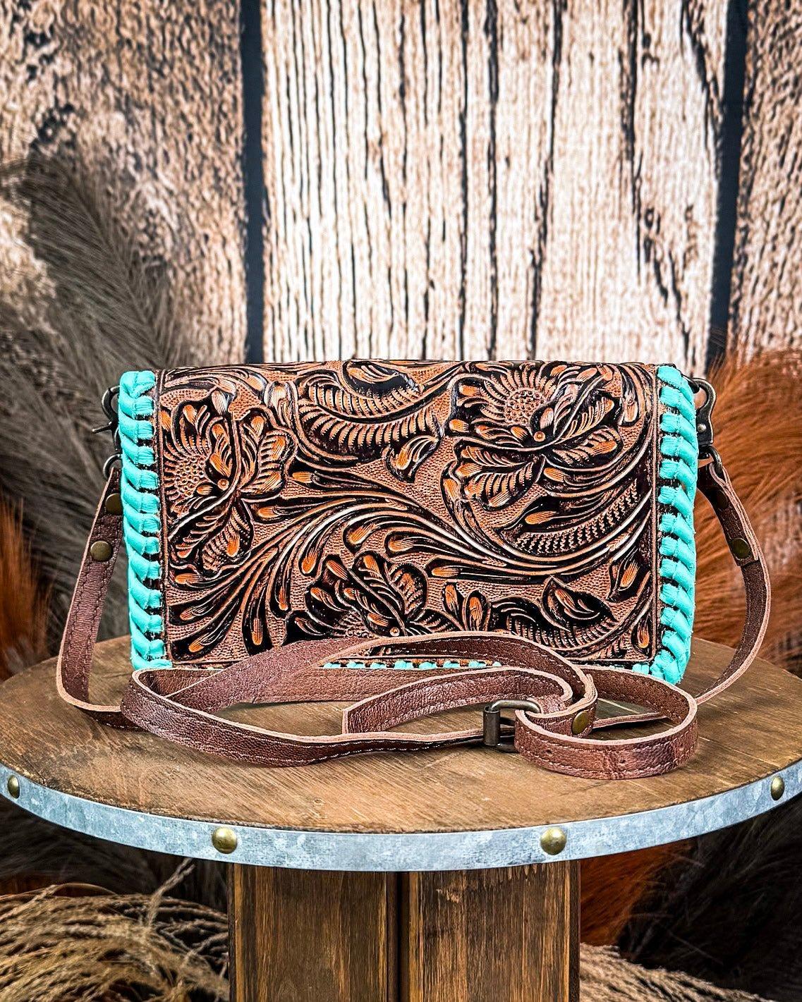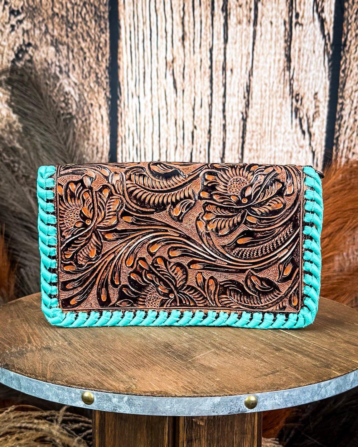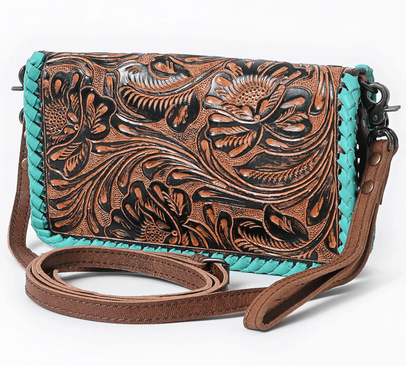 Don’t let her size fool ya—The Hattie Jane Convertible Crossbody Wallet brings big energy. With intricate floral tooling, bold turquoise braided edges, and a smart, two-compartment design, this piece blends western style with everyday function like a total pro. She’s a wallet, a wristlet, and a crossbody—basically, your new favorite sidekick.