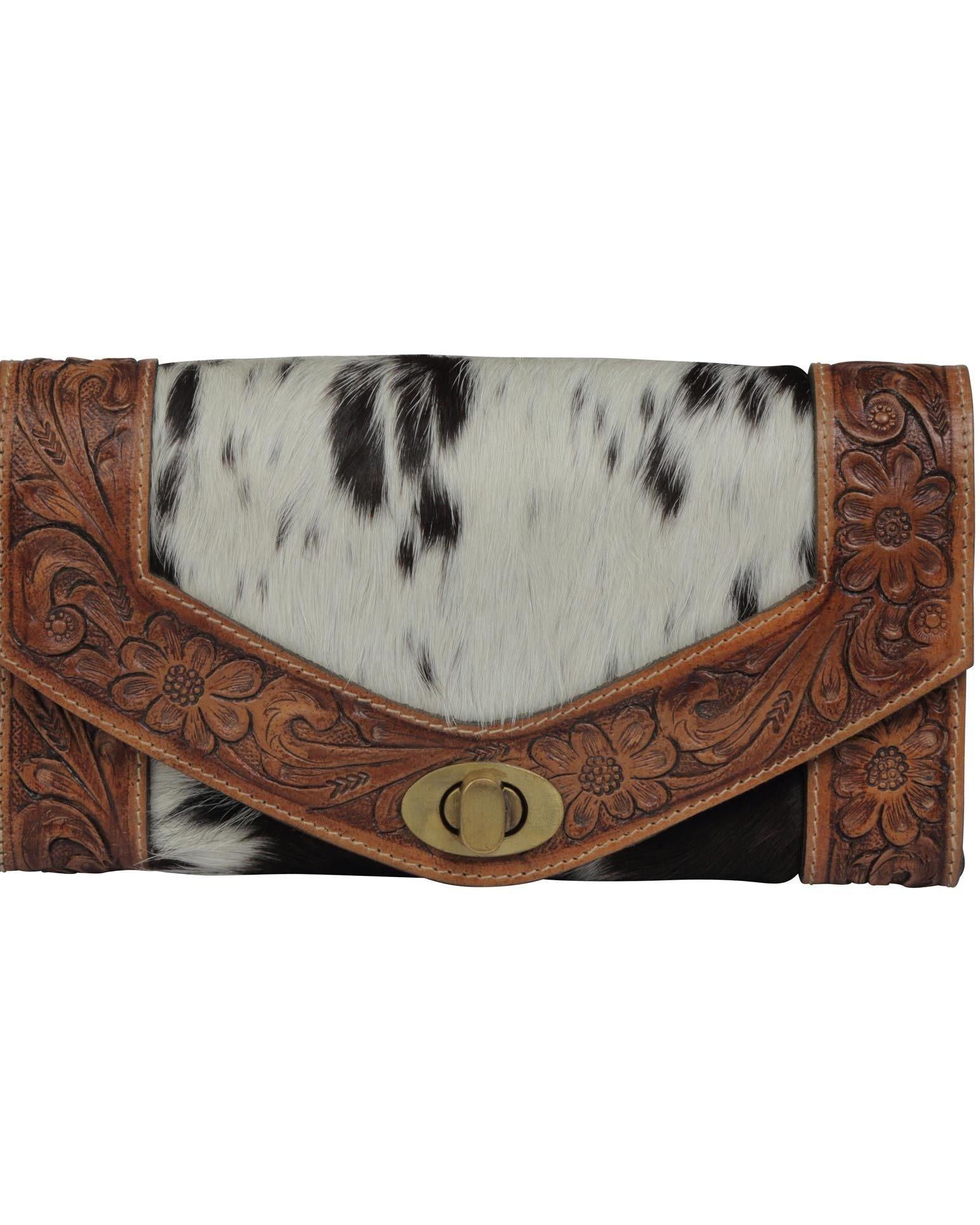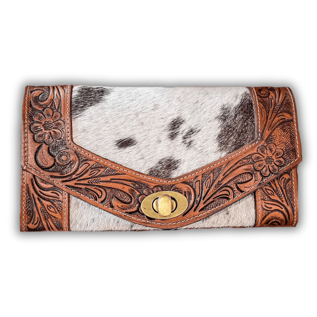 Handcrafted by Myra Bag with genuine hair-on-hide and tooled leather, the Advent Wallet is where rustic charm meets artisan detail. No two are exactly alike, thanks to the natural variation in hide patterns and tones—so yours will always be one of a kind, just like you. Hair-on-hide colors and patterns will vary, making each wallet as unique as the gal who carries it. The floral tooling is full of soul, with a vintage-western vibe that adds just the right amount of detail without feeling too busy. And that turn-lock closure? Simple, secure, and so satisfying to use.
