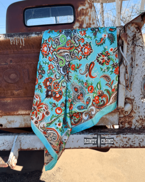 • The Taos Valley Wild Rag is all about embracing color, pattern, and personality. With its bright turquoise base, vibrant floral details, and swirling paisley accents, this scarf is made to stand out in the best possible way. It’s lively, it’s fun, and it adds instant personality to anything you pair it with—whether you’re dressing up for a special night or adding a playful twist to your everyday jeans-and-boots combo.