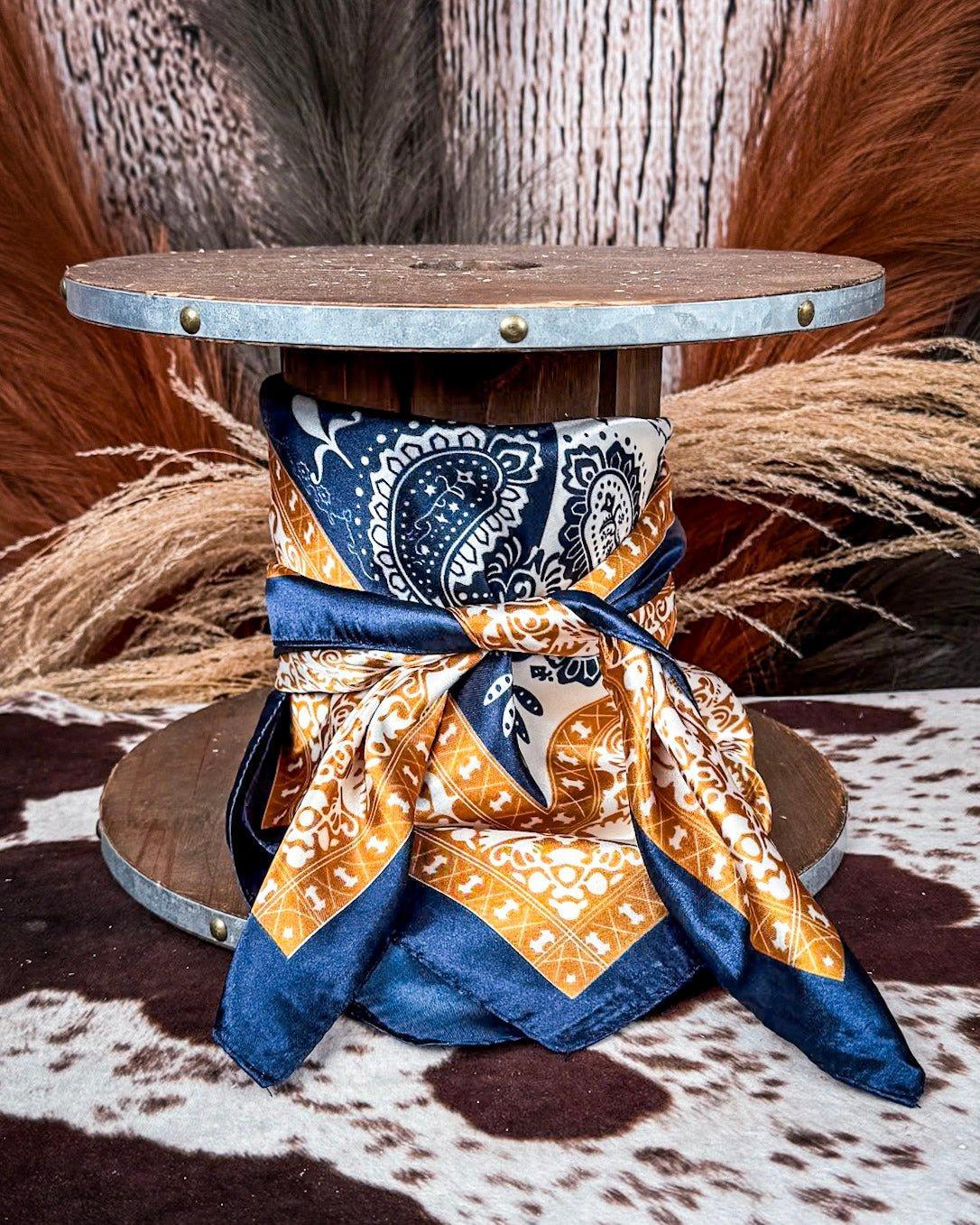 Turn heads and show off your western flair with the Thatcher Wild Rag. This bold accessory combines timeless paisley charm with rich, modern tones of navy, cream, and coppery gold. The intricate dual-tone paisley center contrasts beautifully against the ornate border, creating a look that’s both sophisticated and versatile.