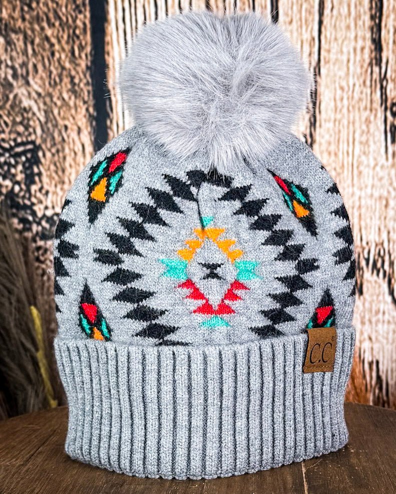 Cold-weather style, made easy. The Light Grey Aztec Pom Beanie by C.C. is that perfect balance of cozy comfort and bold detail.