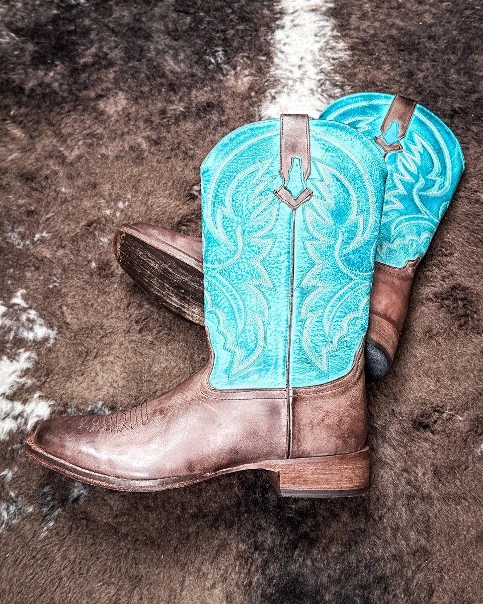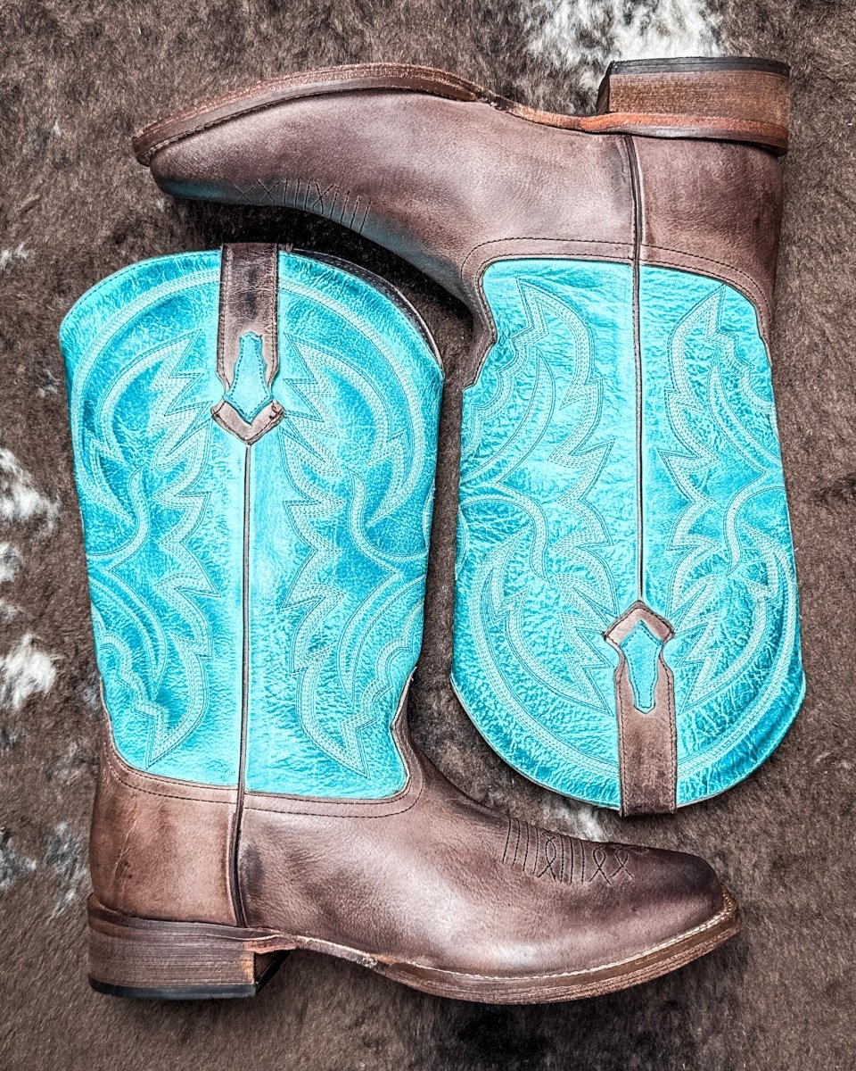 Make a statement in the Lindsey Turquoise Boots by Roper—a bold blend of classic western design and modern color. These square toe boots feature a burnished brown leather foot and a vibrant turquoise shaft, finished with intricate western stitching that pops. Whether you’re dressing up denim or adding edge to a flowy dress, this pair brings color, comfort, and character.