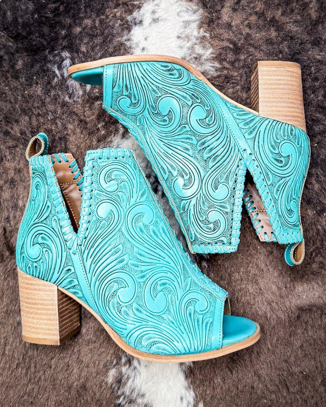 The swirling tooled floral design is embossed across the entire upper, bringing depth and texture to the striking turquoise finish. Whipstitch detailing along the ankle adds a handcrafted touch, while the peep-toe silhouette keeps them playful and versatile for year-round wear.