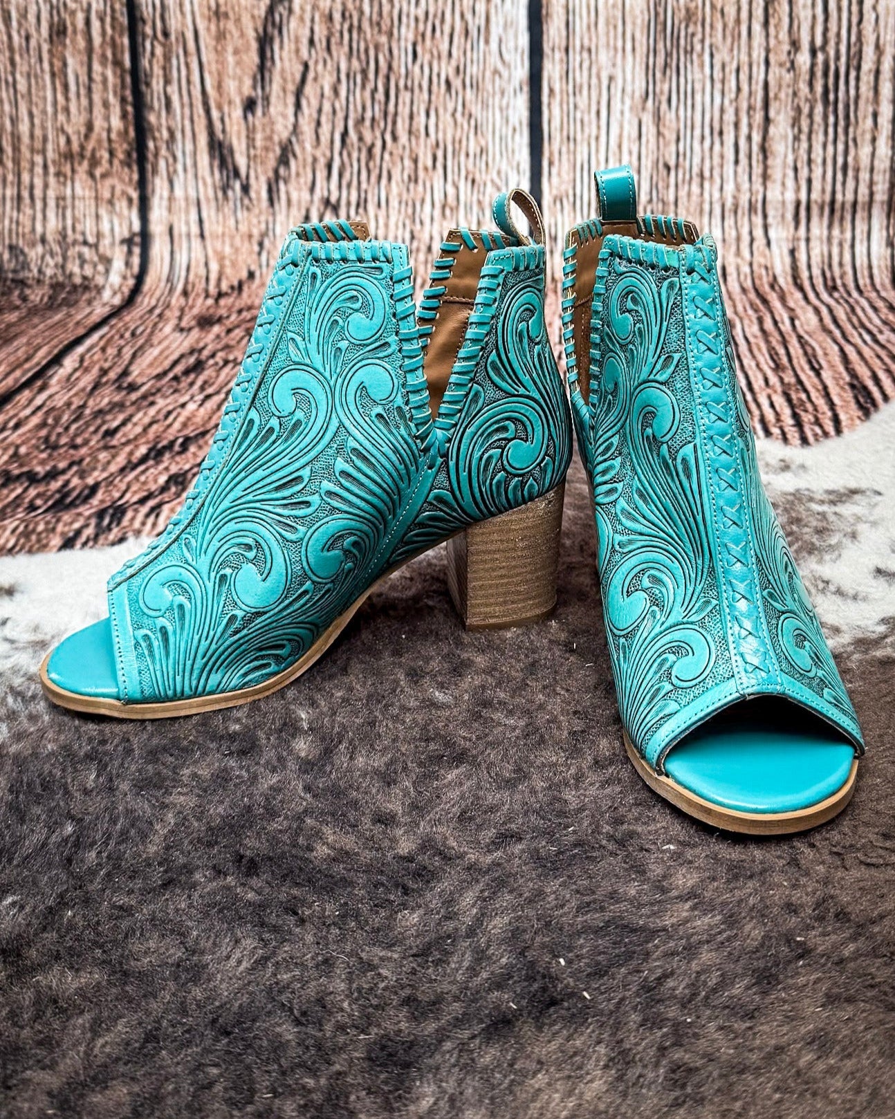 Turn every step into a statement with the Myra Persimmonee Heels in Turquoise. Crafted from genuine tooled leather, these vibrant peep-toe booties combine bold color with timeless western artistry.