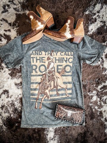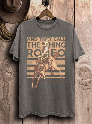 Dress like you are headed for a rodeo - even if it is just for picking up the groceries - in our newest And They Call The Thing Rodeo Graphic Tee. Adorned with a bronc rider and boasting a cool gray mineral wash, this tee is more than a piece of clothing; itβs a statement. It champions the oversized boyfriend fit, ensuring a blend of comfort and style that'll turn head wherever you go. This tee doesnβt shout βrodeo,β it whispers it, confidently, and we all know how seductive whispers can be. Welcome to the sweet spot between the Wild West and urban chic - and we promise, it's as comfortable as it sounds.