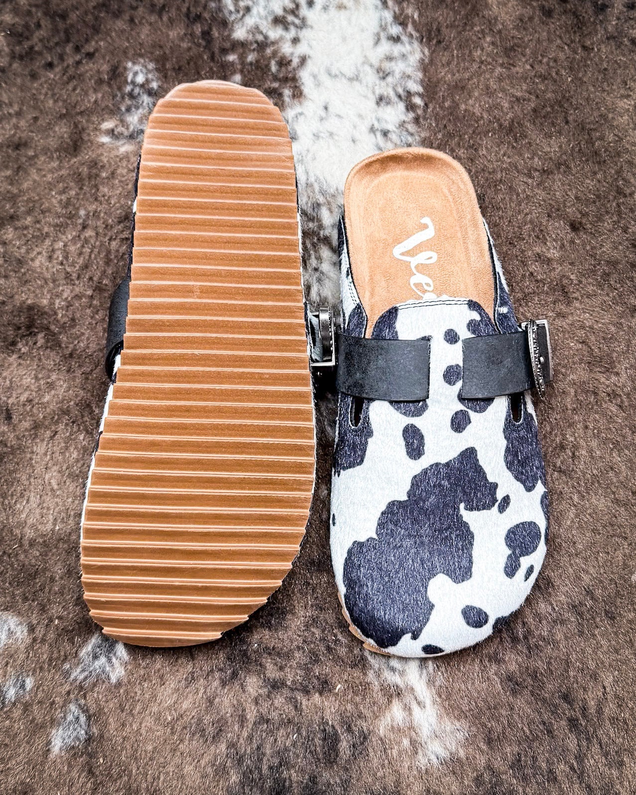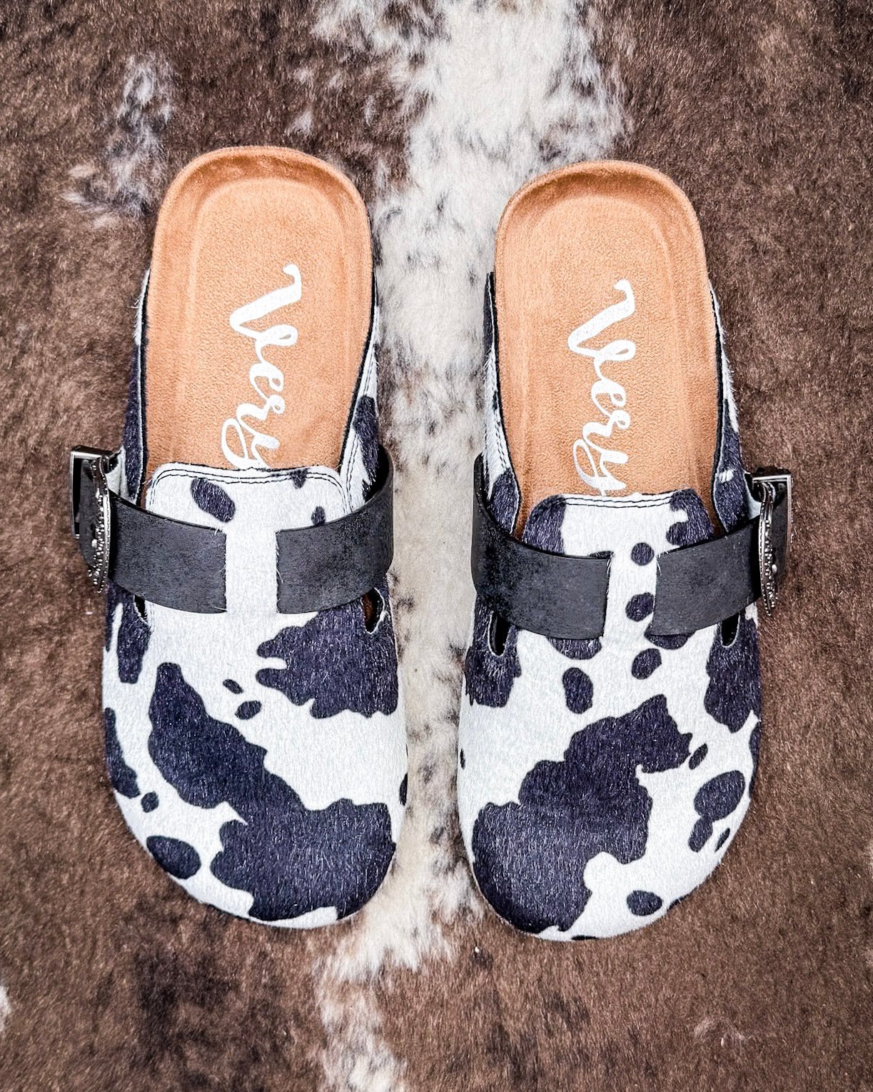 Comfy meets cool in the Andi Slip-On Mule in Black Cow Print by Very G—a laid-back essential with just the right amount of western flair. With its bold black-and-white cow print and burnished silver buckle, this mule brings an easygoing edge to your everyday lineup.