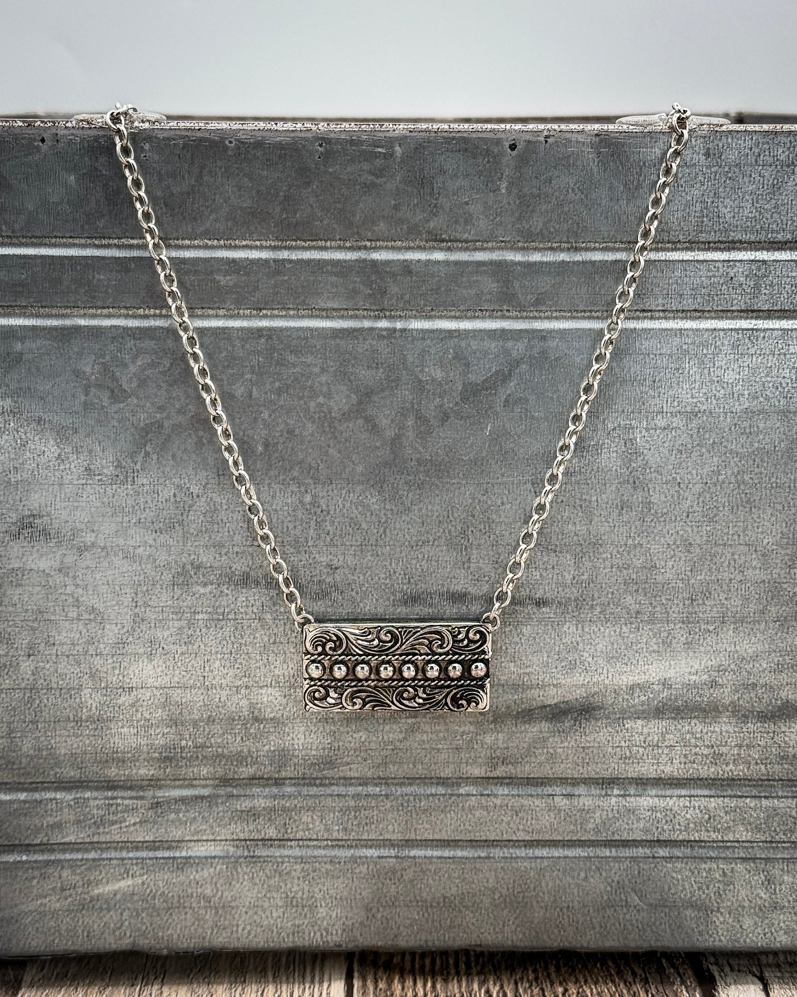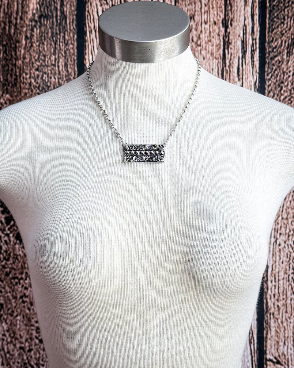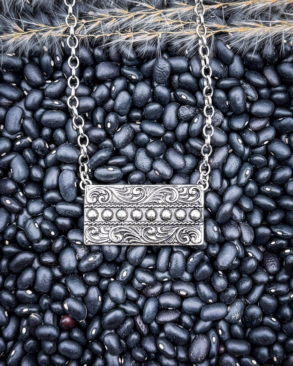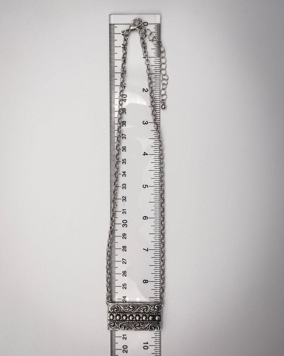 This western bar necklace features an engraved rectangular centerpiece finished with raised silver tone beading for added texture and dimension. The detailed scrollwork brings a vintage feel while keeping the design clean and versatile, making it an easy everyday piece with quiet western influence.