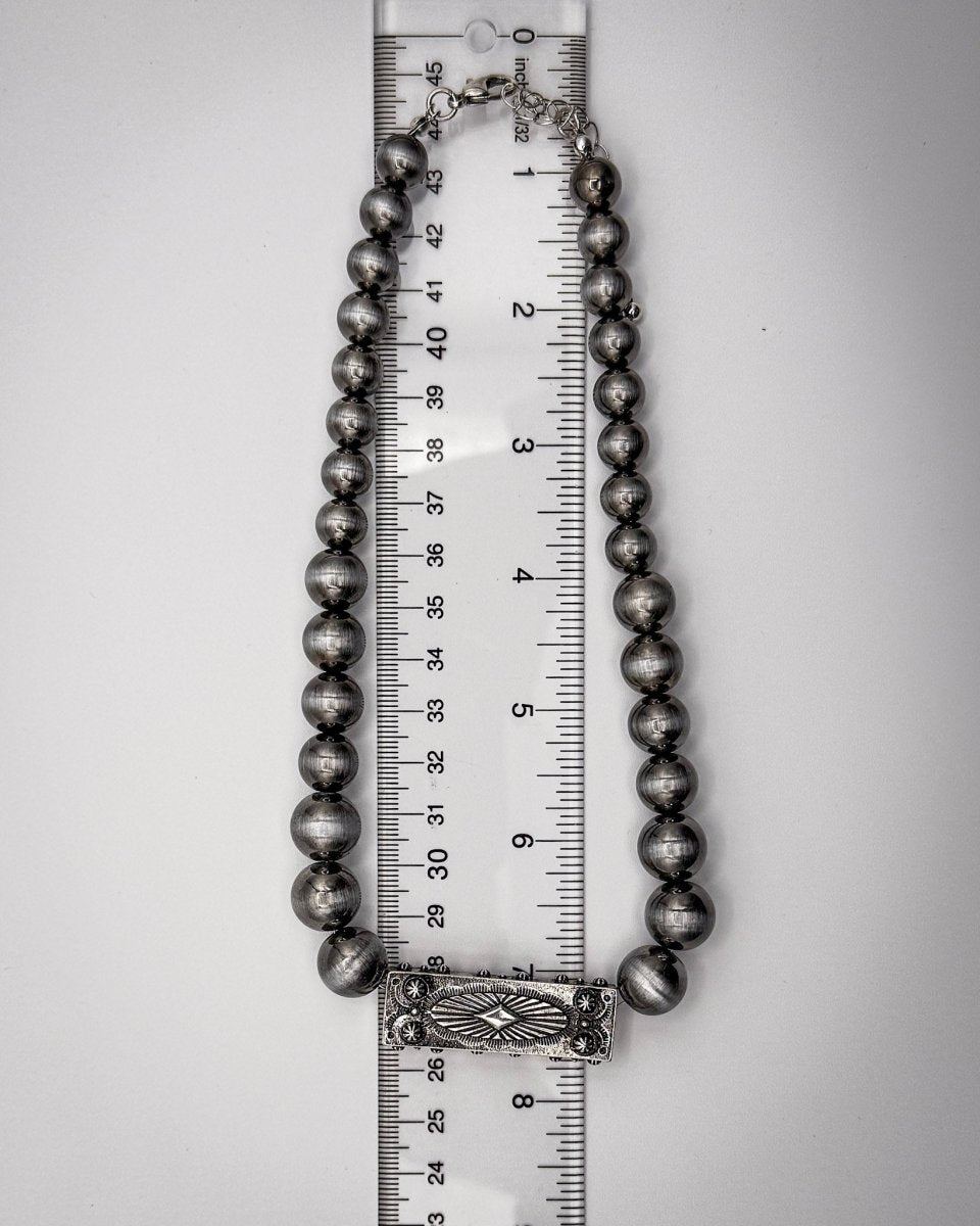 The evenly sized round pearls create a clean, uniform look, while the engraved bar centerpiece adds quiet texture and a focal point without overpowering the design. The muted metal tone keeps the necklace versatile and easy to style with denim, knits, button-downs, or layered chains.