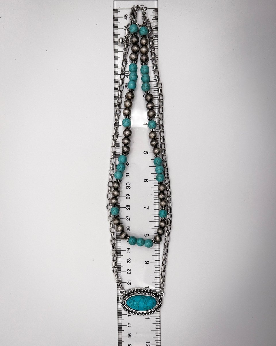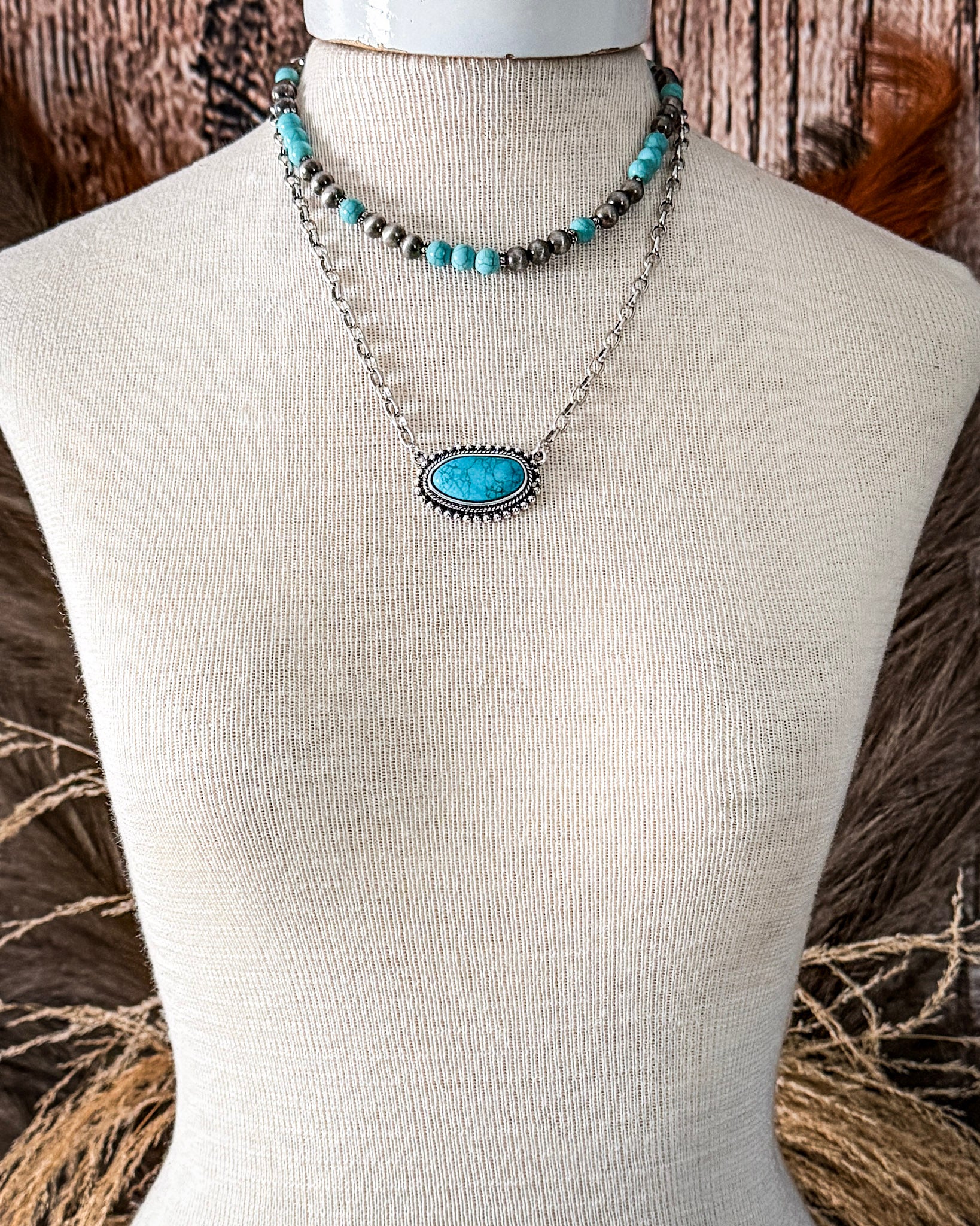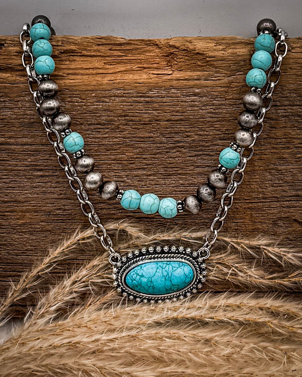 The top strand brings texture with mixed beading, while the lower chain drops into a detailed oval faux turquoise pendant framed in silver. It’s layered, eye-catching, and full of western edge.
