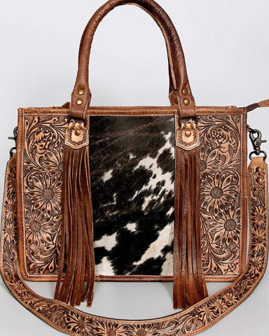 At the heart of the Betsy Tote is a striking center cowhide panel, exuding natural beauty and uniqueness with its one-of-a-kind pattern. No two bags are exactly alike, making this tote truly special. The cowhide panel is framed by intricately hand-tooled leather panels on either side, showcasing the expert craftsmanship and attention to detail that American Darling is renowned for. The hand-tooled floral patterns evoke a sense of tradition and artistry, celebrating the rich heritage of Western culture.