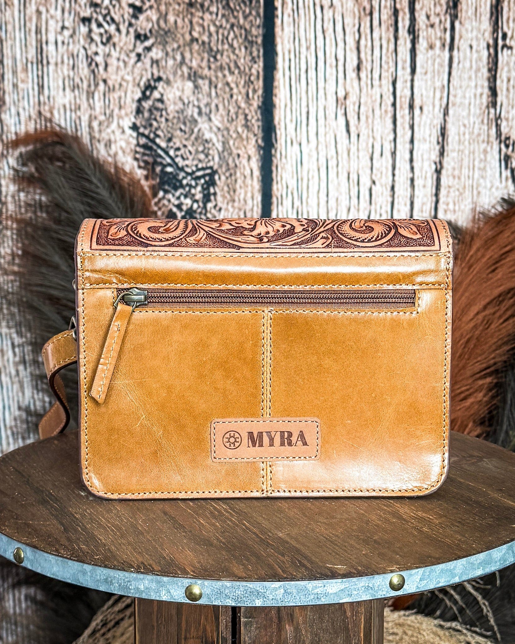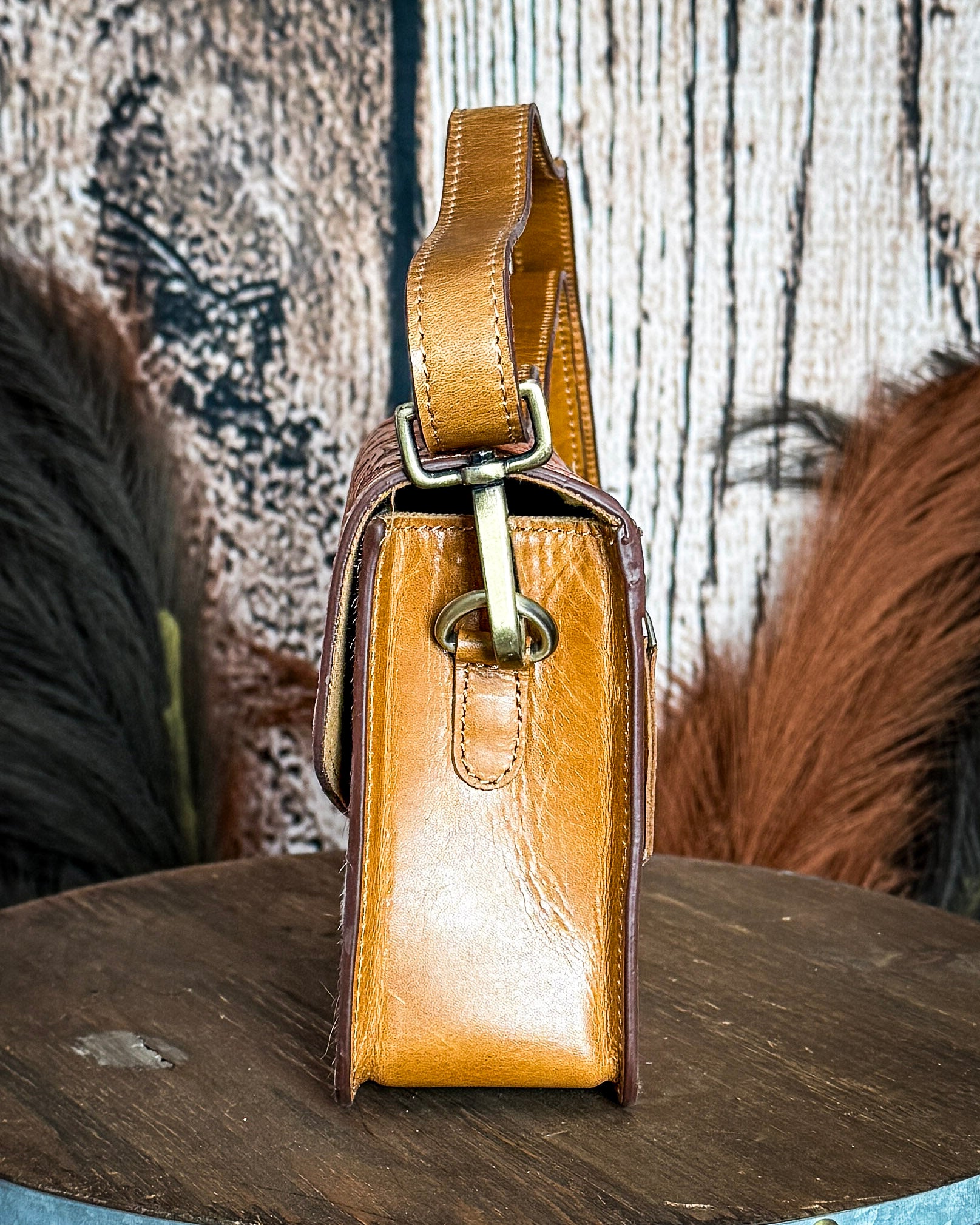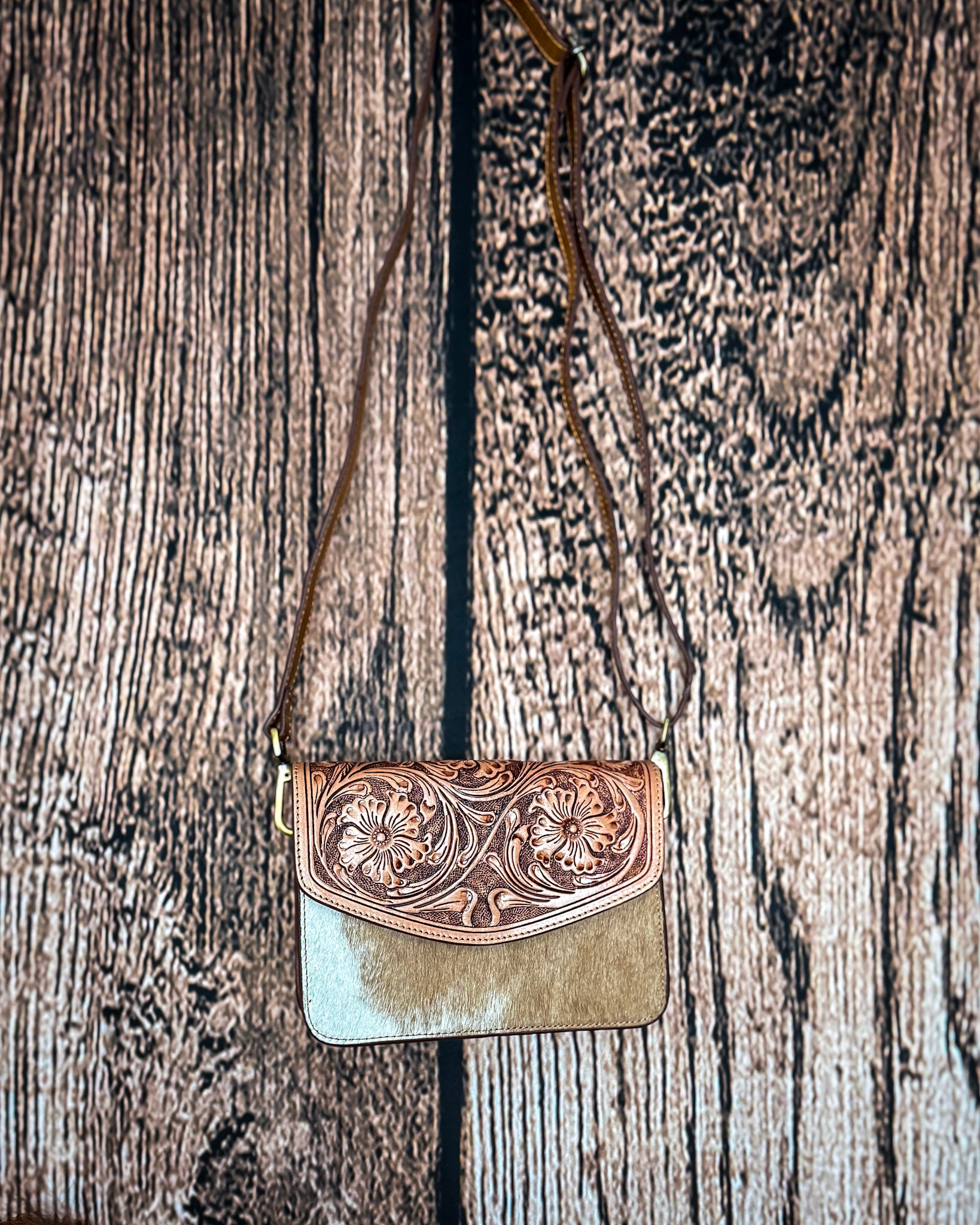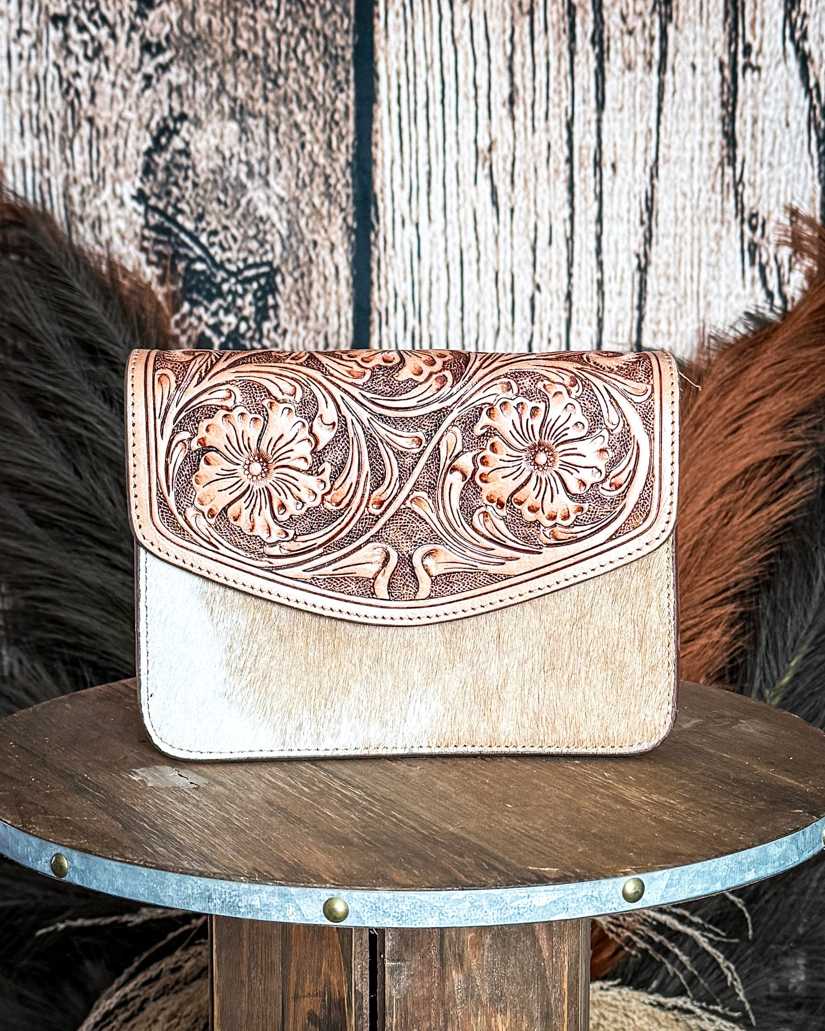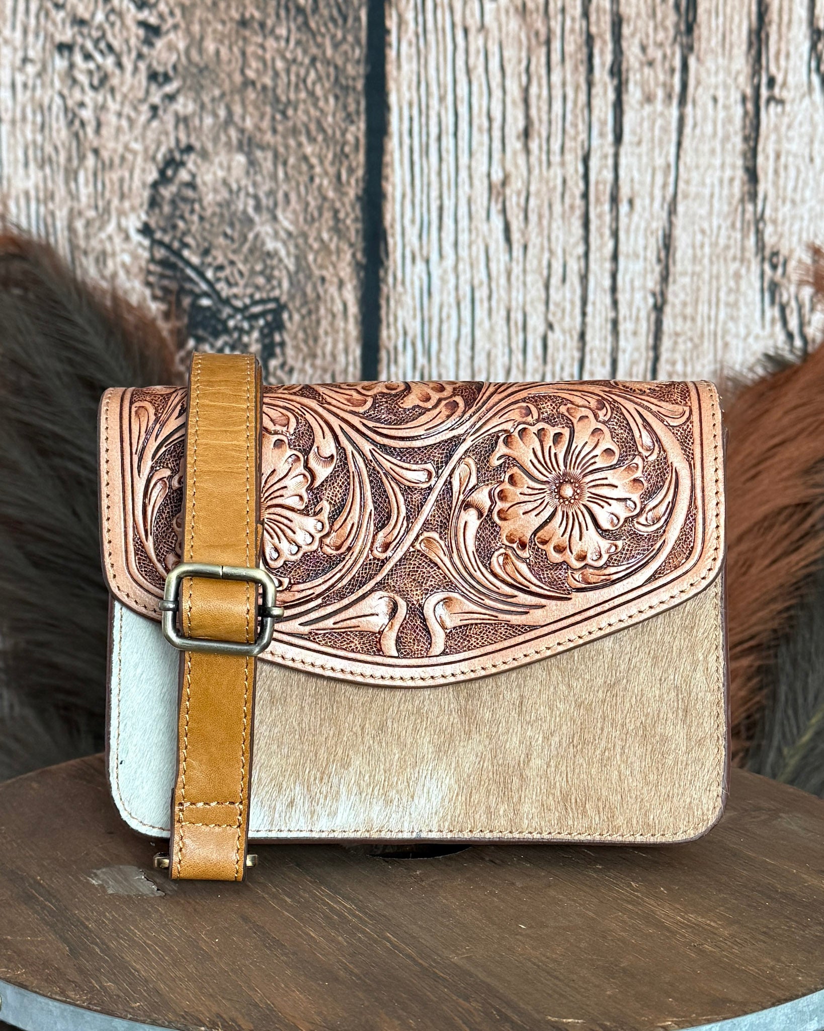If you love those pieces that feel timeless but still a little special, the Bridle Blossom Hand-Tooled Hair-On Leather Bag by Myra Bag is such a beautiful pick. The rich amber leather paired with the hand-tooled floral flap gives it that classic western feel, while the hair-on hide body adds just the right amount of texture and contrast.