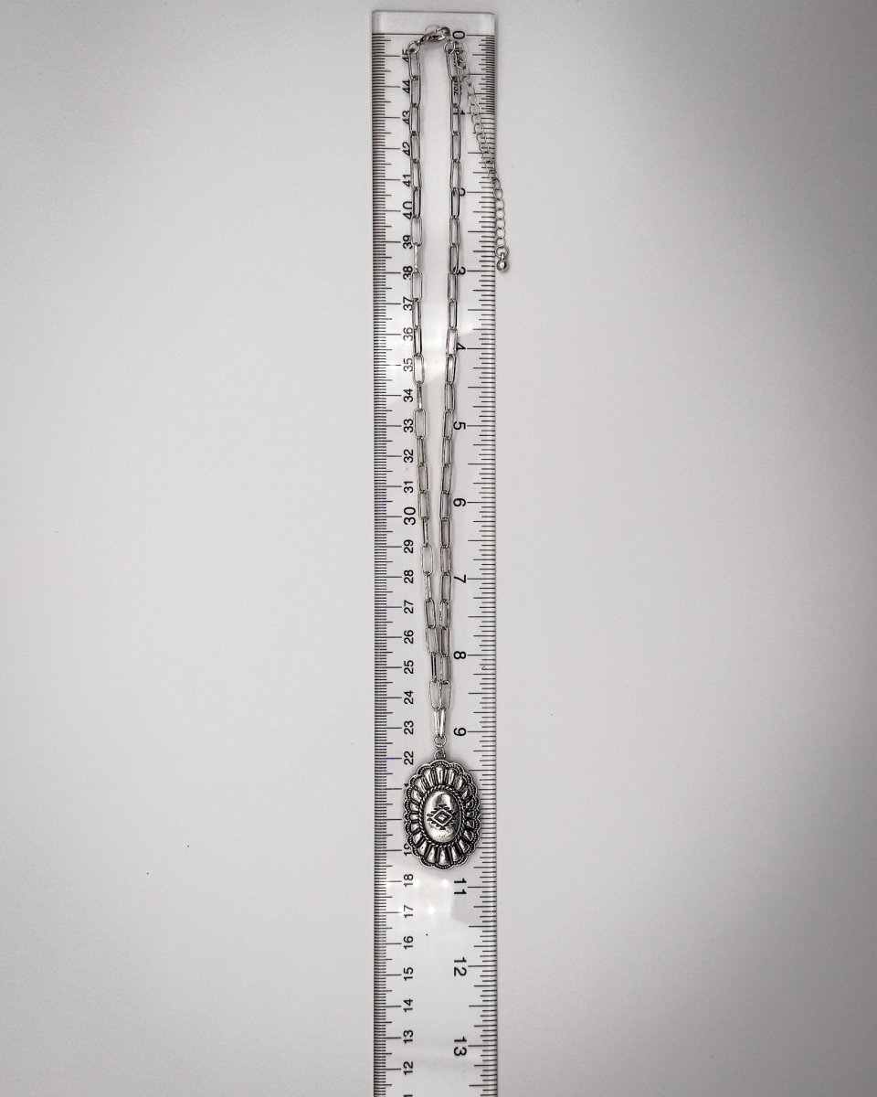 - Concho-style round pendant with raised detailing
