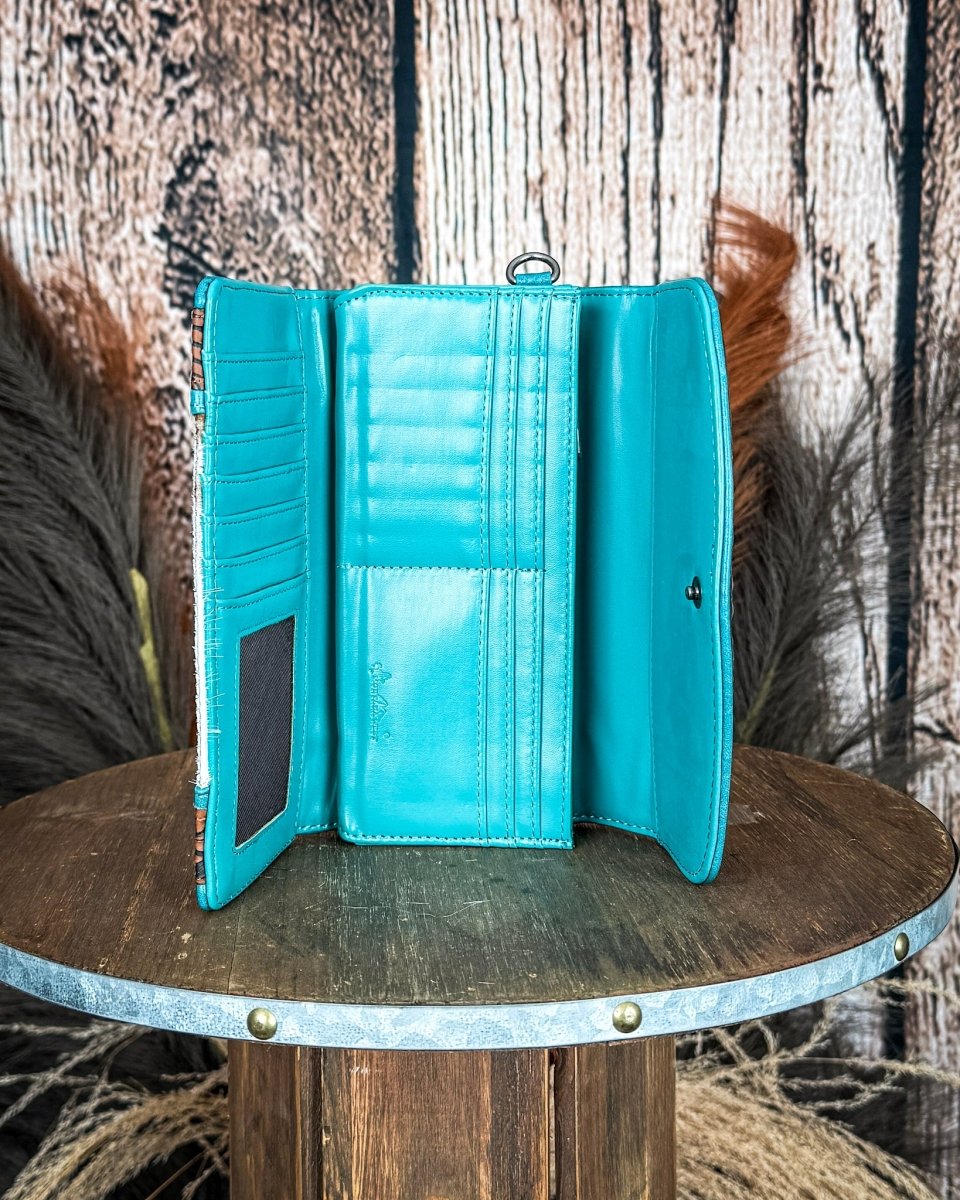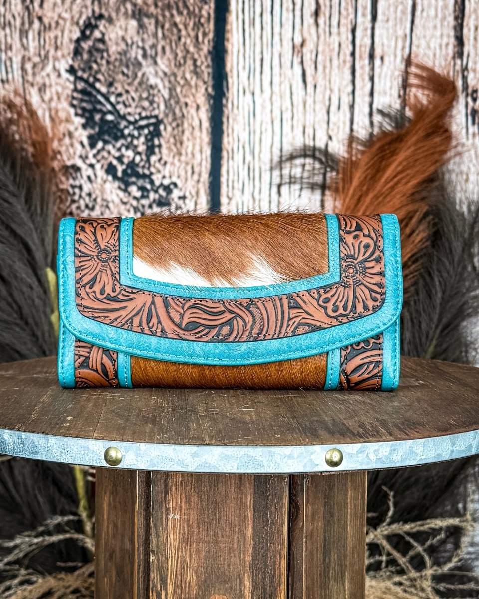 Rich brown floral embossed trim adds depth and western character, while the striking turquoise accent frames the design and gives this wallet a fresh, eye-catching look. The combination of earthy hide tones and vibrant turquoise creates a style that pairs perfectly with denim, boots, and everyday western outfits.