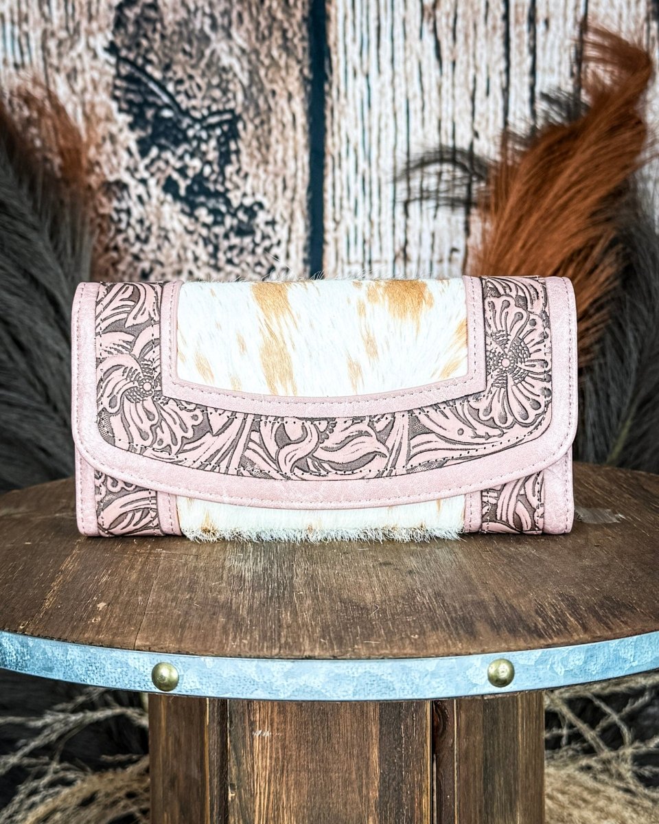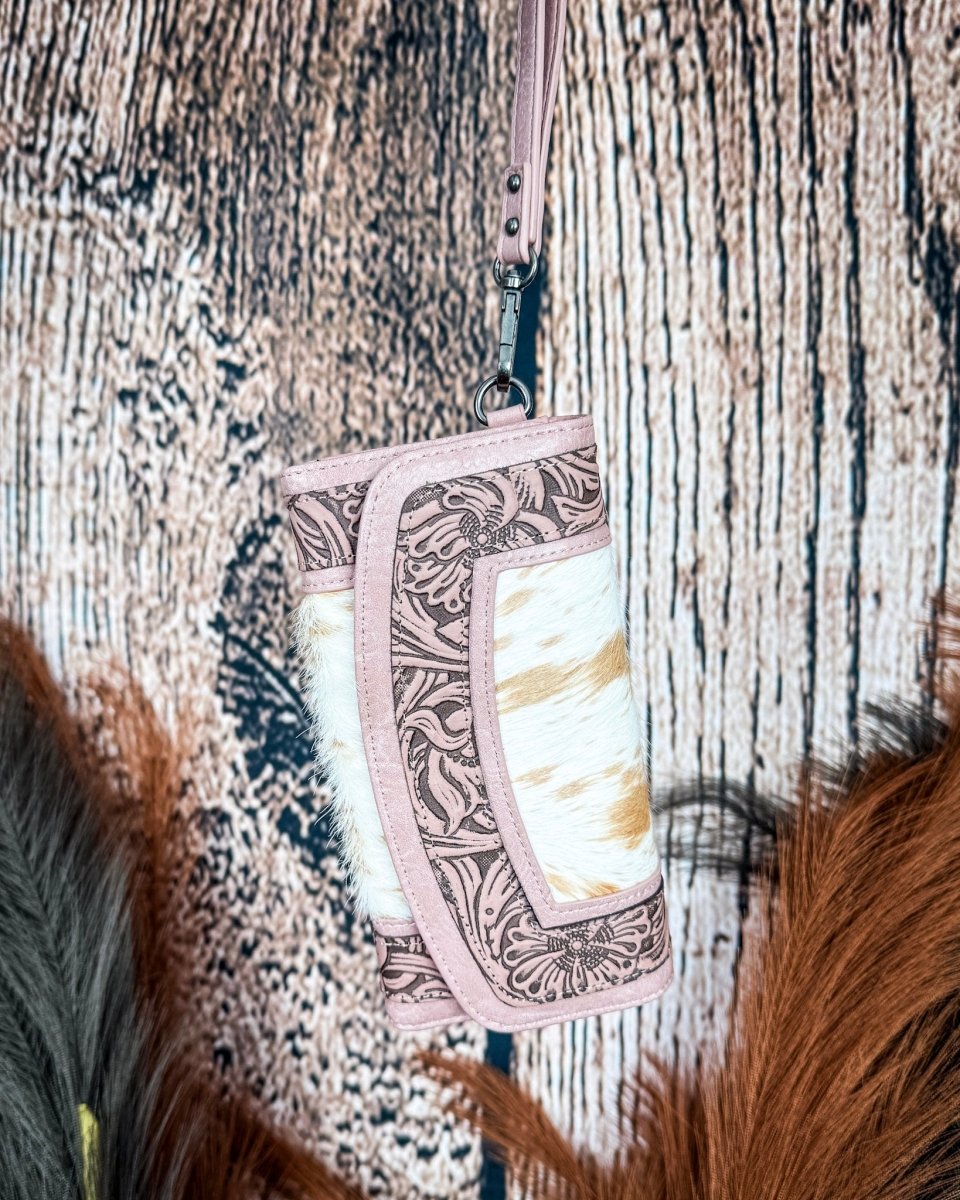 The Canyon Ridge Hide Wristlet Wallet by Montana West blends soft western charm with everyday practicality. Designed with genuine hair-on hide on both the front and back, this wallet features natural texture and unique pattern variations, making every piece one of a kind. The soft pink tone paired with the natural hide creates a feminine western look that stands out while still feeling classic.