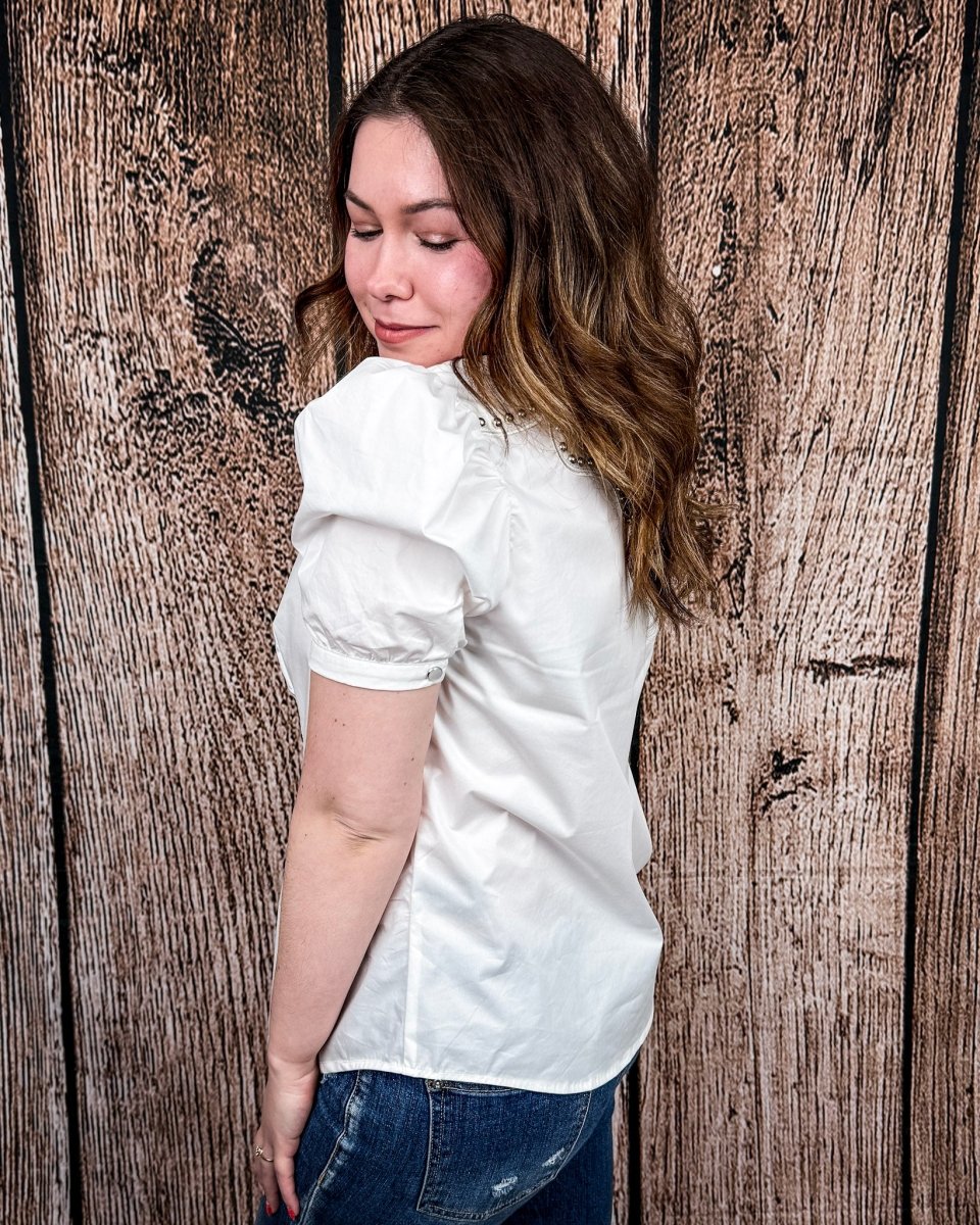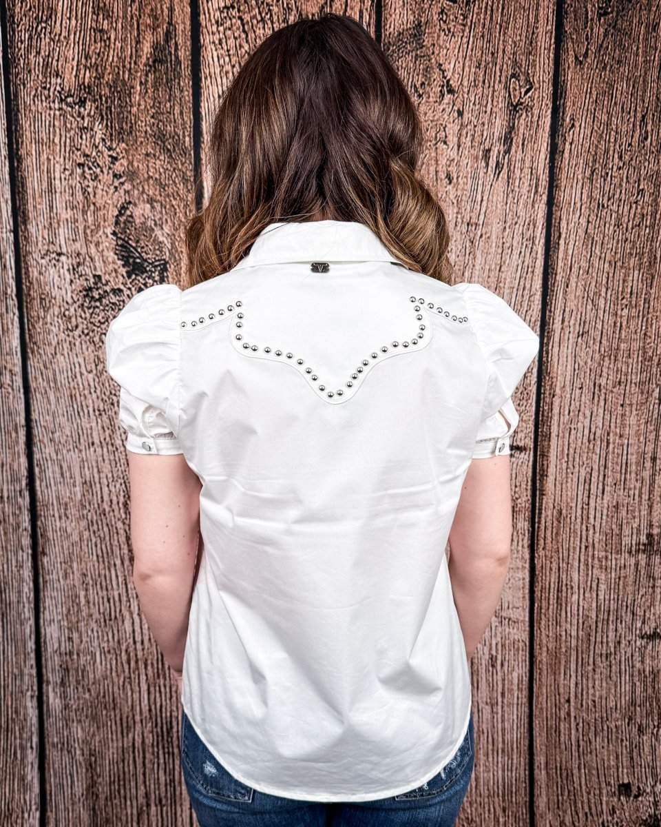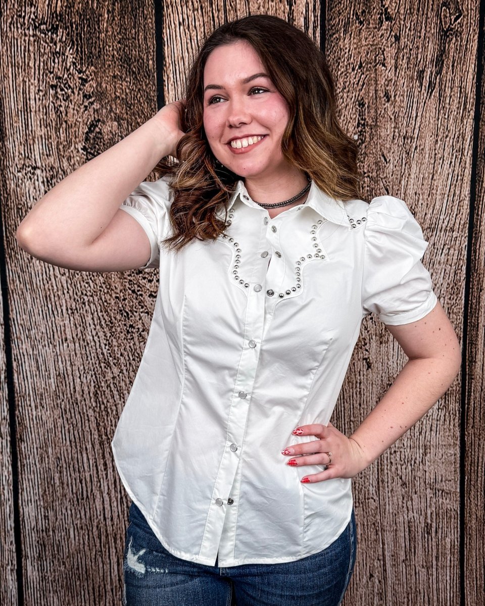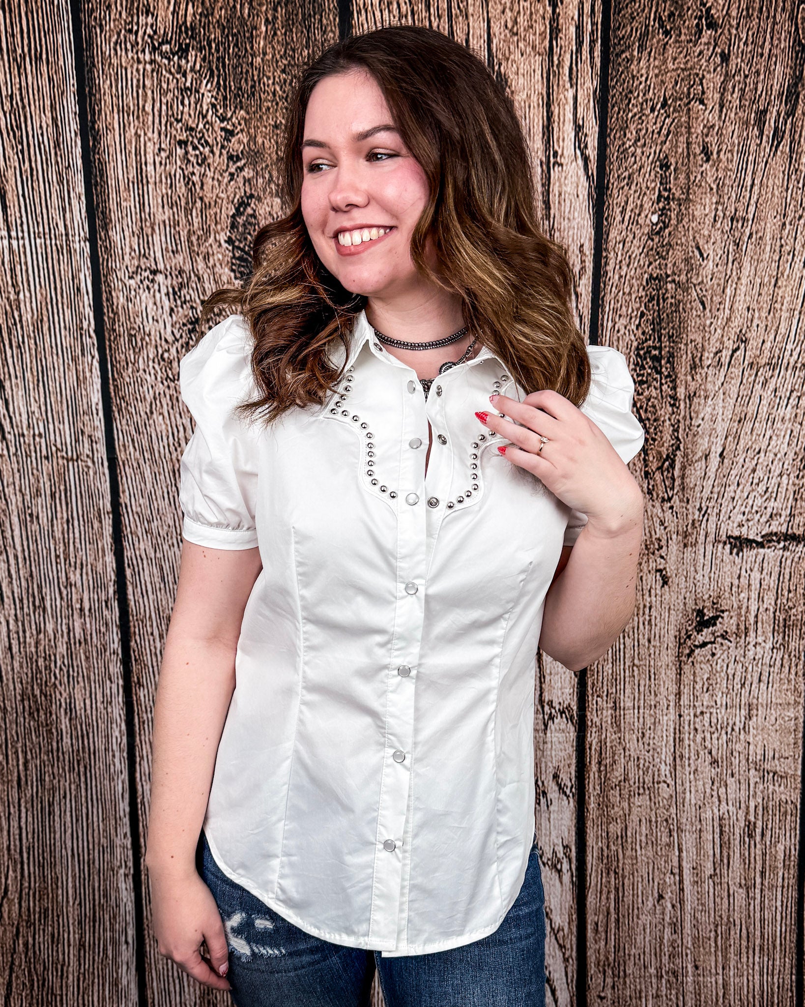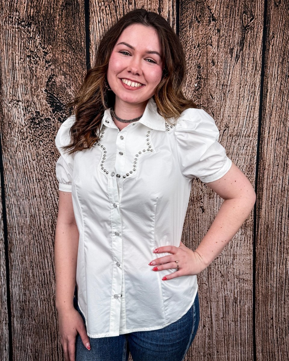 The Celeste Puff Sleeve Studded Pearl Snap Shirt in Ivory by Lucky and Blessed brings polished western style with a bold, feminine edge. Cut in a crisp, structured cotton blend, this top has that clean, tailored look customers love, while still feeling comfortable enough for all day wear. The dramatic puff sleeves add instant shape and elevation, making it an easy upgrade from a basic button down.