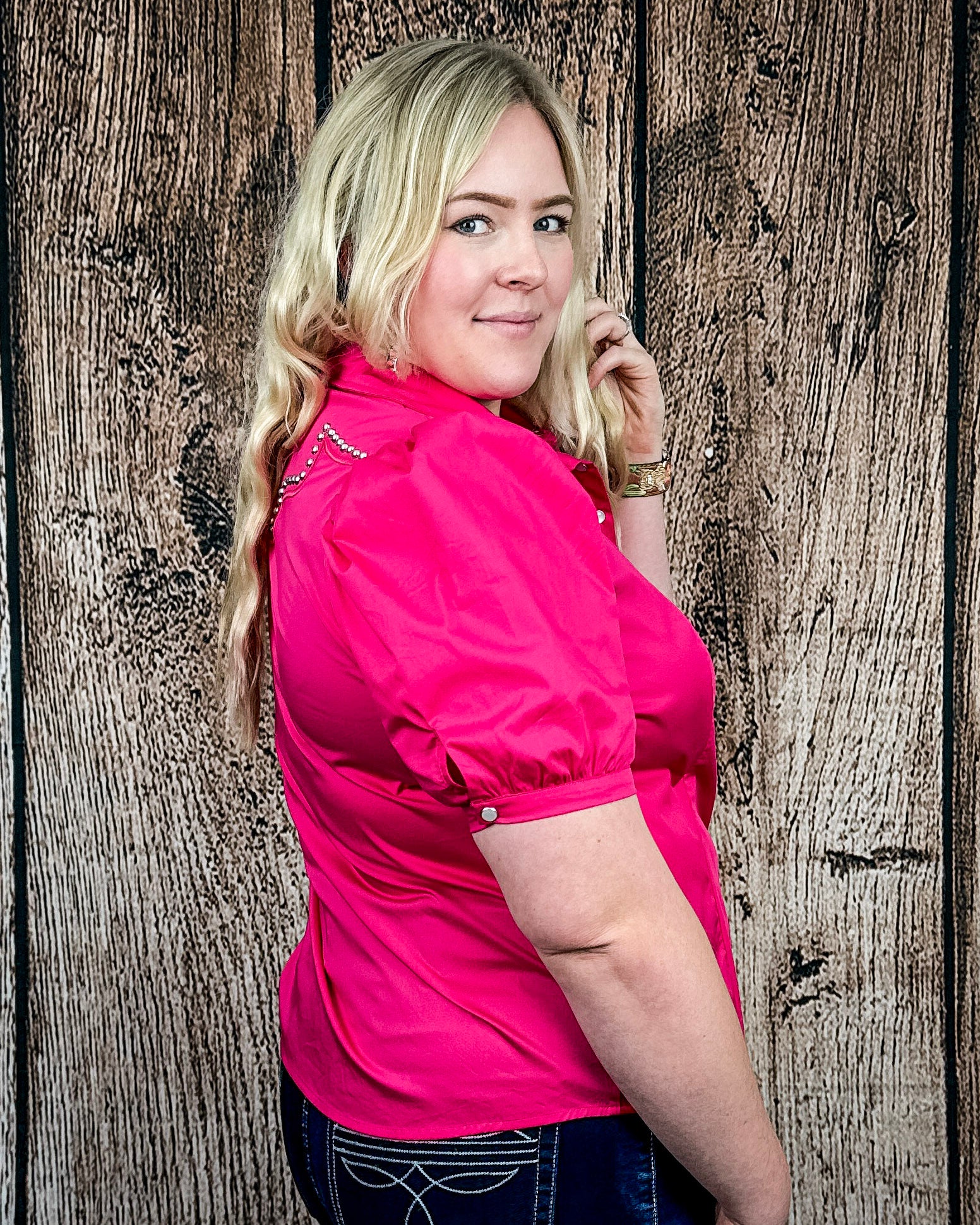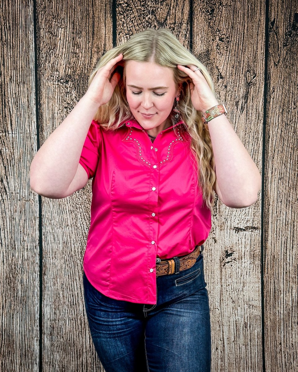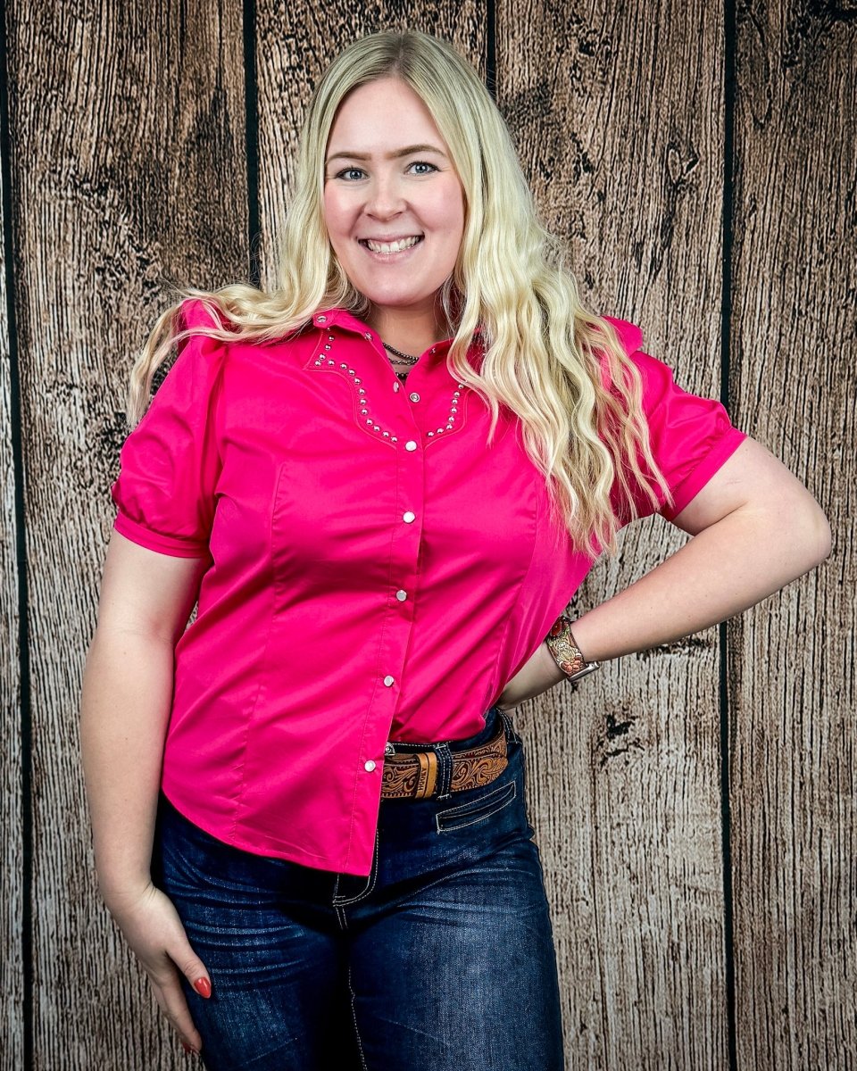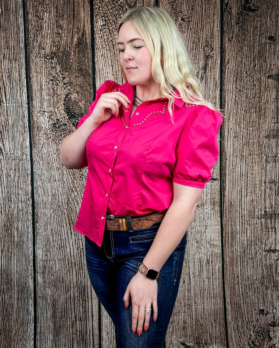Western yoke detailing across the chest is accented with antique silver studs, adding eye-catching dimension without overwhelming the look. Puff short sleeves soften the structured design, creating a balance of strength and femininity. The vibrant pink hue adds a confident pop of color while staying true to timeless western style.