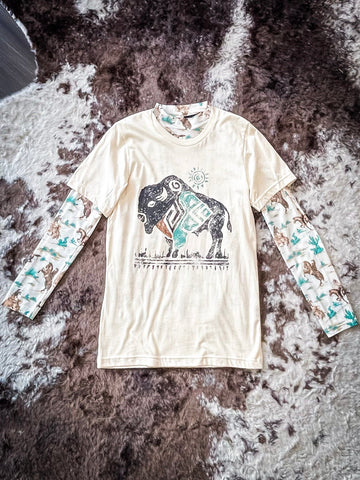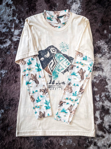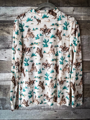 This top features a gorgeous blend of soft turquoise, golden yellows, and sunset rust tones, creating a graphic that’s pure southwest soul. From the cactus silhouette to the cowboy on horseback, it captures everything we love about wide open spaces and that golden hour glow. It’s semi-sheer, so it works beautifully over a bralette for a bolder look or layered under your favorite graphic tee or denim vest for a more laid-back vibe.