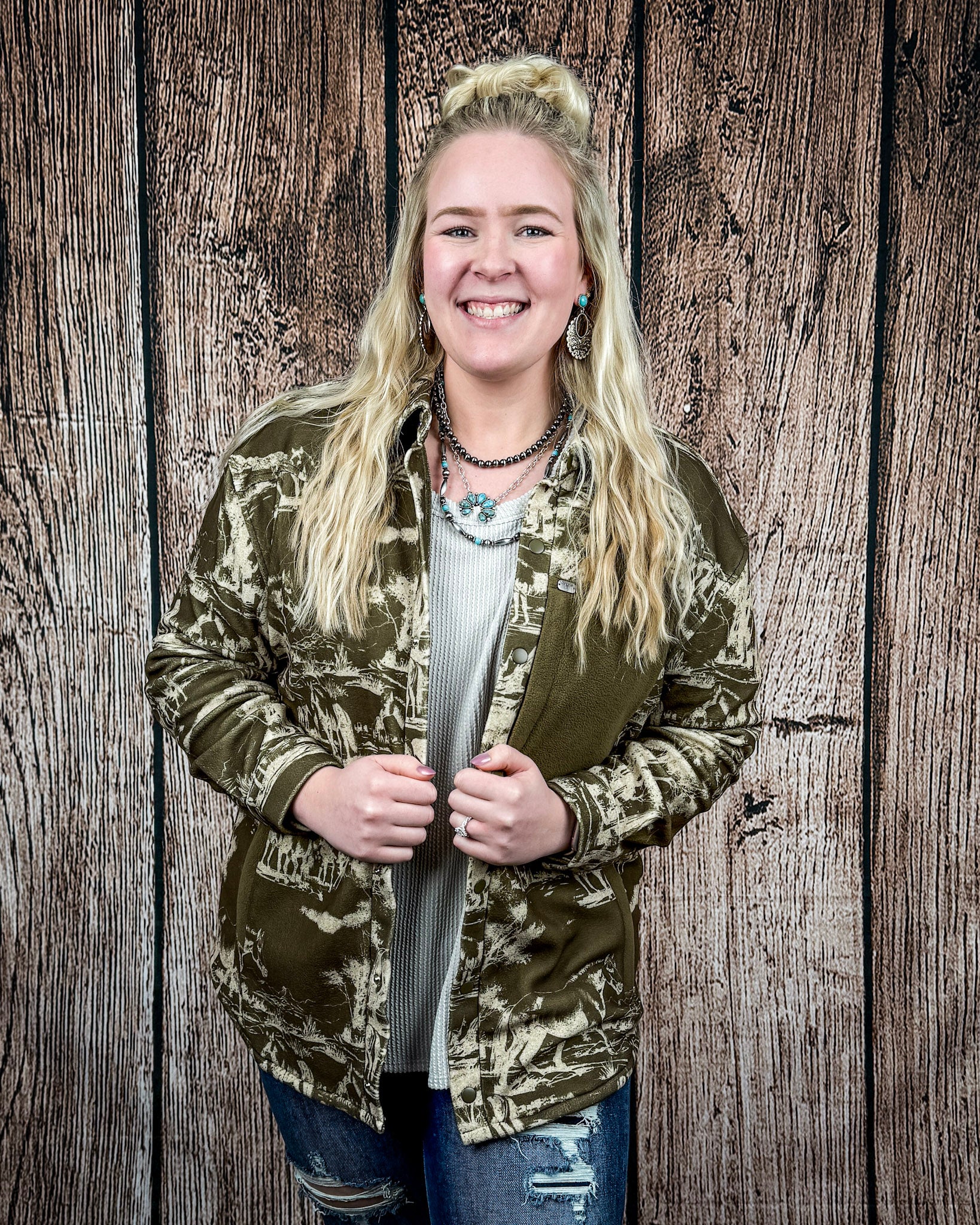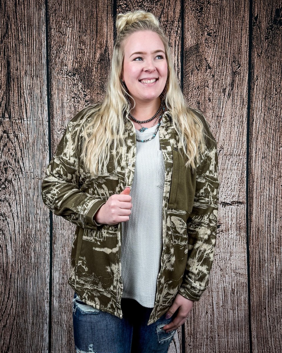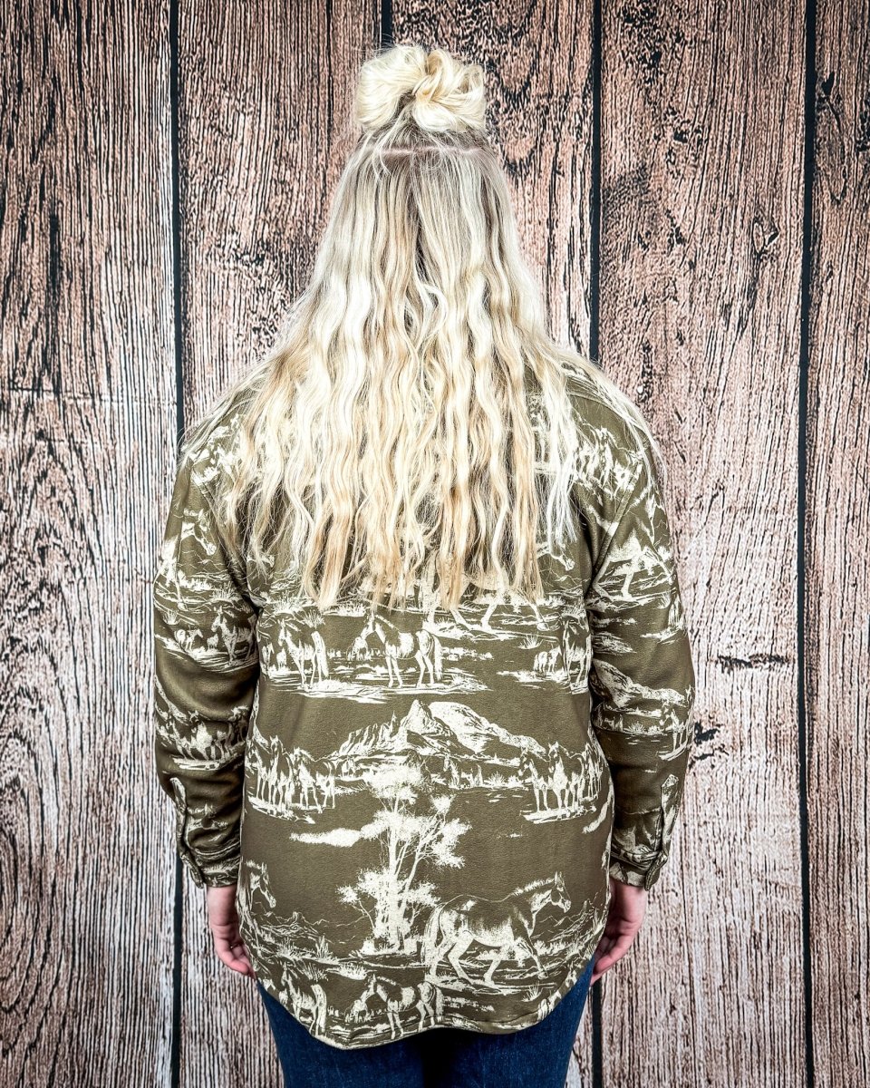 Grab that instantly-cool layering piece you'll live in all season. The Cimmaron Range Horse Print Fleece Shacket in Olive pairs a scenic ranch horse print with an easy, oversized feel that looks styled without trying. The muted olive base keeps it grounded and wearable, while the allover print adds just enough Western personality to stand out in a crowd.