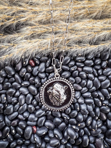 Designed for the modern cowgirl with a love for classic, heirloom-inspired jewelry, this pendant showcases an intricately detailed cow head cameo set within an ornate frame. The fine craftsmanship brings out every contour of the cow’s features, symbolizing strength, resilience, and the enduring connection between Western culture and the land. The vintage-inspired oval cameo setting adds a timeless feel, making this piece a versatile addition to both casual and dressy ensembles.