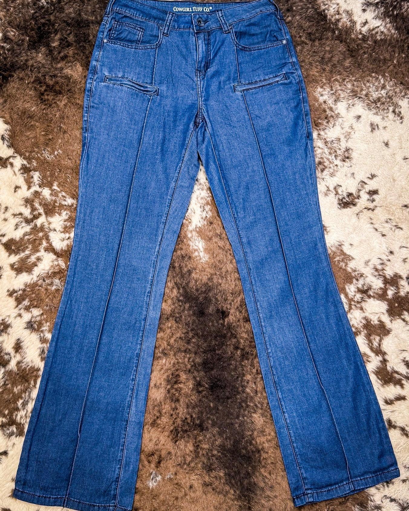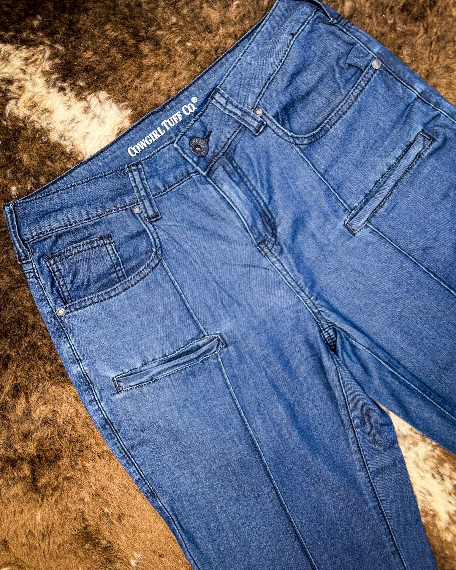 Flip to the back and you’ll find Cowgirl Tuff’s signature barbed-stitch detail on the pockets—tonal and understated but full of attitude. It’s the kind of detail that sets these jeans apart without shouting for attention.
