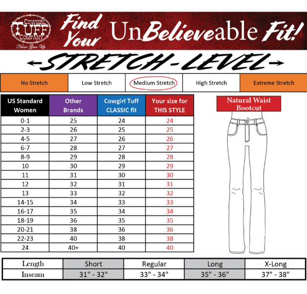 Fit Tip: Every Cowgirl Tuff style fits a little different—and that’s exactly why we include a specific size chart for each style right here on the page. Be sure to check it out before you add to your cart so you can snag the perfect fit the first time.