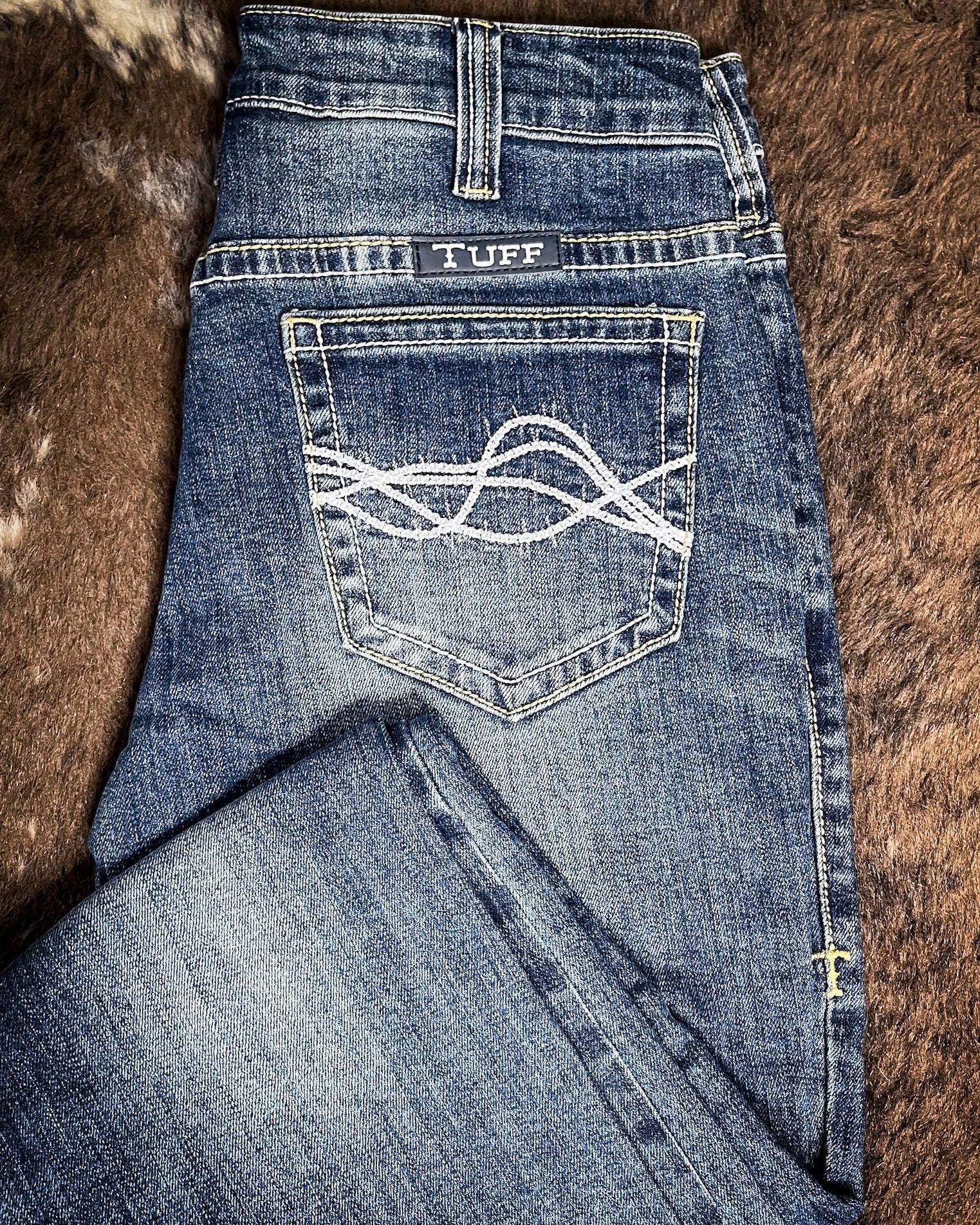 This jean’s got that classic western soul, finished in a beautiful medium blue wash with just the right amount of whiskering and wear. The white and gold stitching adds a clean, versatile touch that pairs effortlessly with everything from flannel and fringe to sparkly tops and leather jackets. And yes, the signature barbwire stitching on the back pockets is still there—subtle, iconic, and unmistakably Cowgirl Tuff.