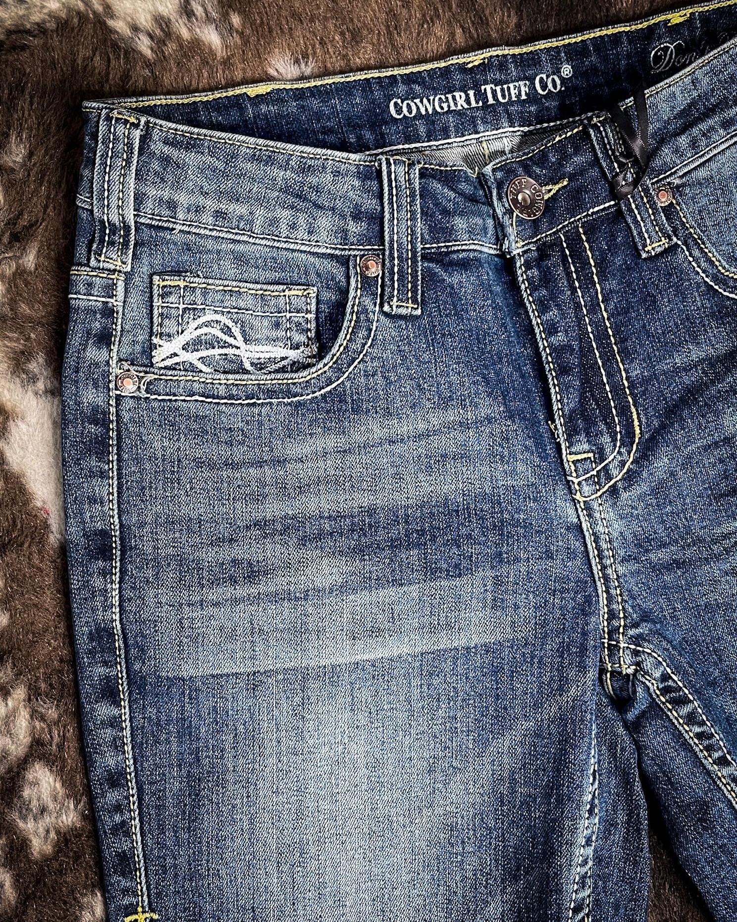 Meet the original, the iconic, the one that made so many folks fall in love with Cowgirl Tuff—the “Don’t Fence Me In” Bootcut Jean. This is the classic that built a following and kept it, thanks to its perfect mix of style, comfort, and downright toughness.Crafted with premium 12 oz denim and just the right touch of stretch (98% cotton / 2% spandex), this jean gives you the freedom to move without ever bagging out. It's structured where you want it, soft where you need it, and strong enough to handle whatever your day throws your way. Whether you're in the saddle, on your feet, or out for a night with the girls, this pair holds up and holds you in.