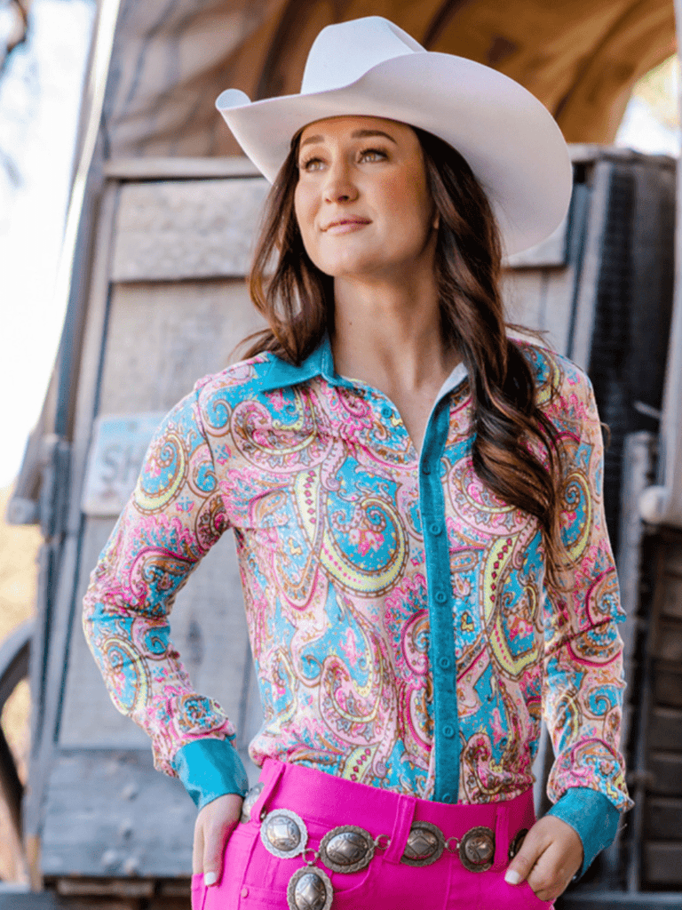 With a kaleidoscope of western-boho paisley swirls in hot pink, golden yellow, teal, and coral, this top brings serious color without ever feeling over the top. The turquoise foil detailing catches the light just right, giving it that glimmer that turns heads (especially under the arena lights or sunshine). And the real showstopper? That pop of turquoise trim along the collar, cuffs, and partial button placket—it’s bold, clean, and oh-so flattering.