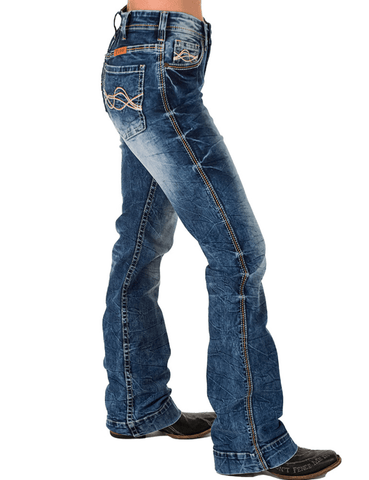 The cool crinkle wash is another eye-catching feature, giving these jeans a trendy yet timeless look. The unique texture of the wash, combined with white and gold stitching, adds subtle detail that makes these jeans stand out without being overly flashy. The classic bootcut leg is designed to pair perfectly with your favorite cowboy boots, offering just the right amount of flare to create a long, lean look.