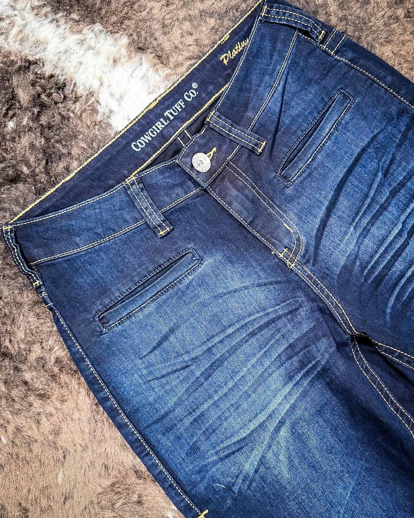 The bootcut silhouette is another essential feature, making these jeans a staple for any wardrobe. The subtly flared leg opening allows them to pair seamlessly with boots, heels, or casual footwear, ensuring versatility no matter the occasion. Whether you're heading out for a casual day on the ranch or stepping into town for a night out, the Platinum Bootcut Jeans rise to the occasion with ease.