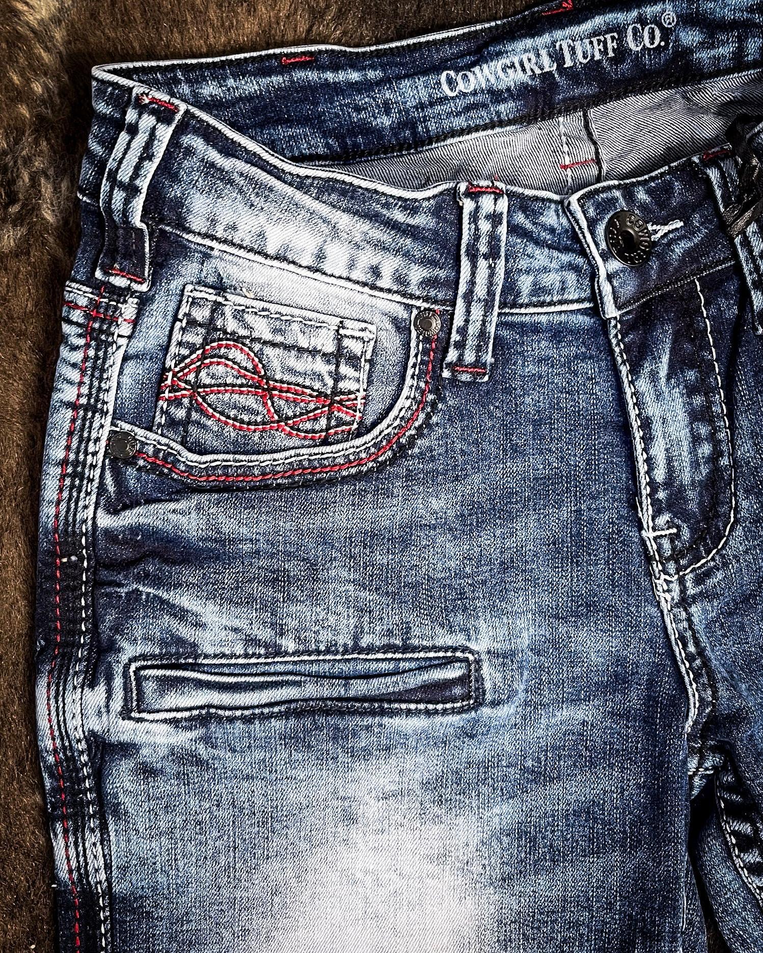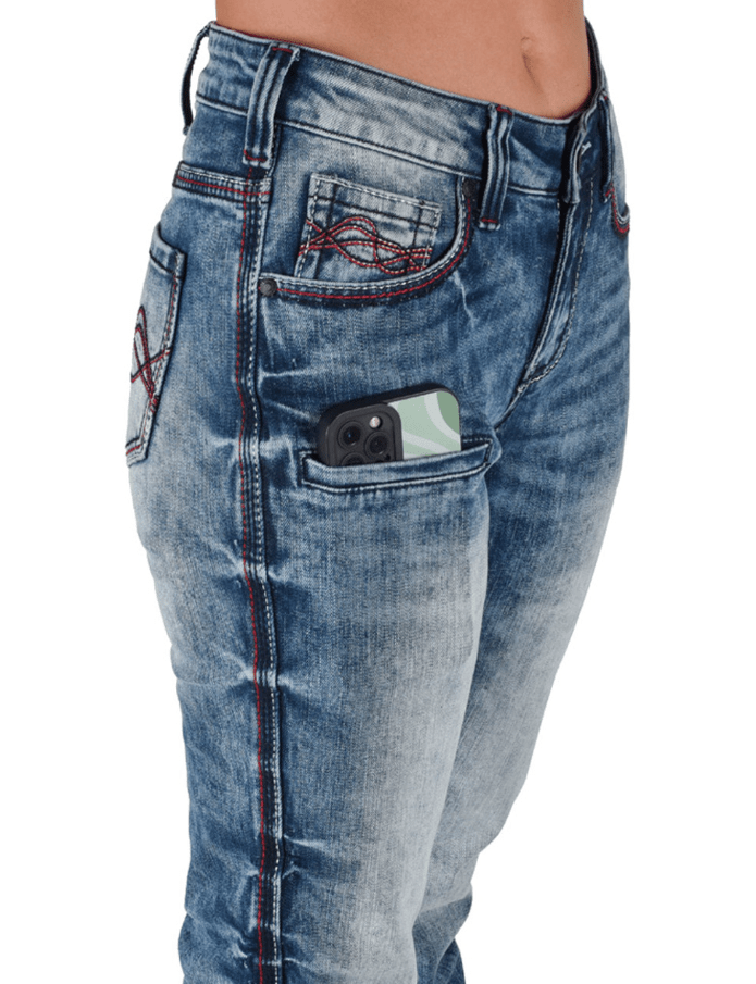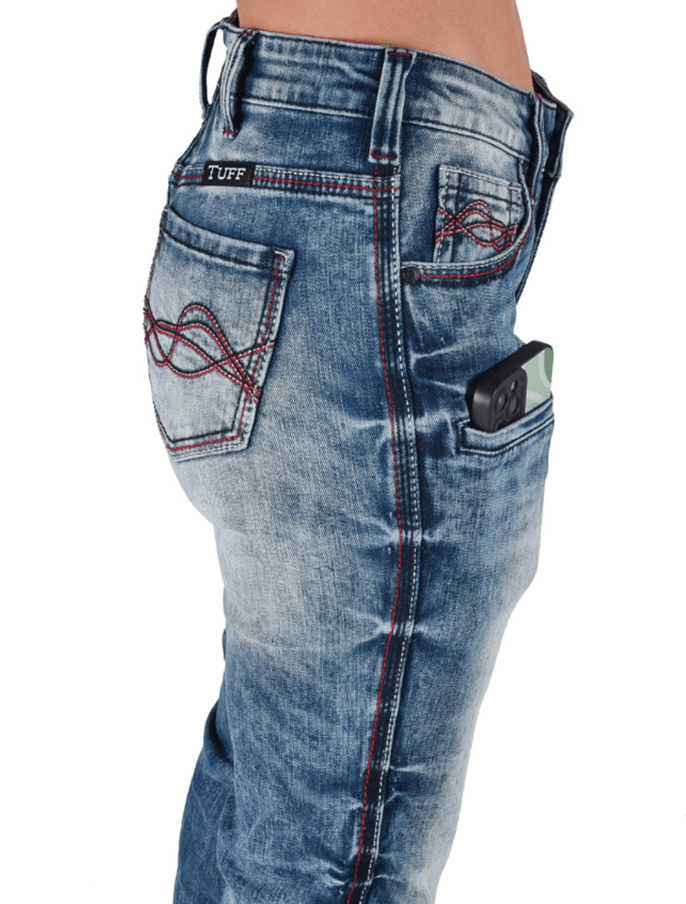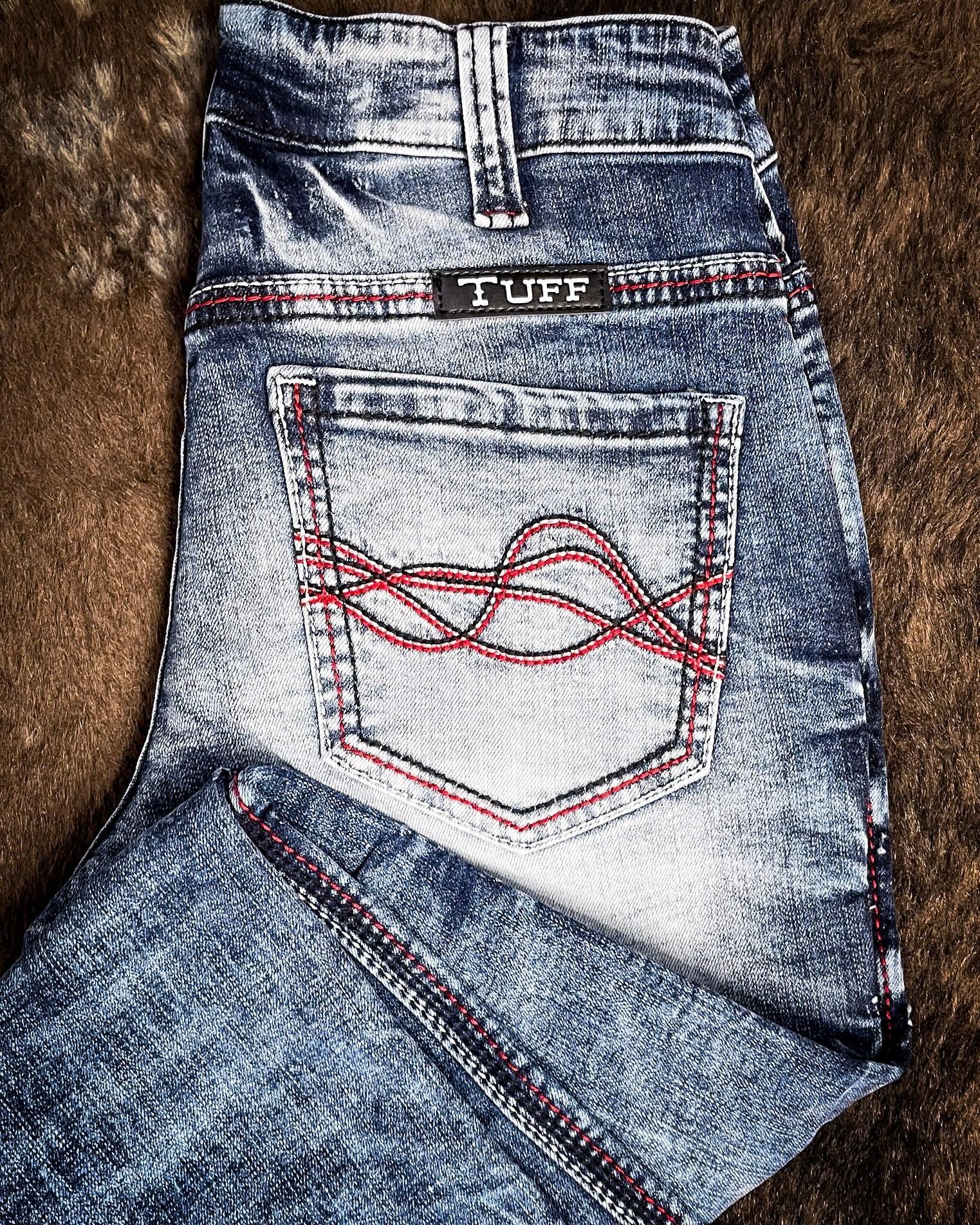 Say hello to the Red Roan Bootcut Jeans, a bold new standout with western edge and serious style. From the eye-catching acid wash to the triple-color stitching, these jeans are here to make a statement—and trust us, they will turn heads.This limited-edition style features a flattering Natural Waist rise (right around 10"–11"), giving you that perfect mid-to-high feel that sits comfortably and holds everything in just right. Made with our Tuff Flex premium denim, these jeans offer medium stretch for that sweet spot between structure and comfort. You’ll get all-day wearability without sacrificing that “real denim” look and feel.
