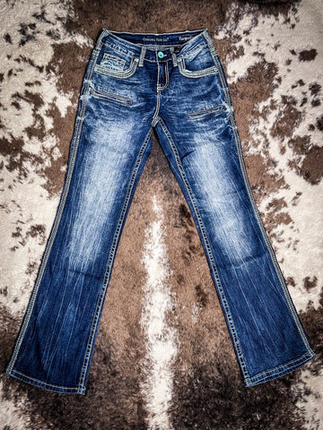 Say hello to the Cowgirl Tuff Turquoise Hurricane Bootcut Jeans—a statement-making style that’s anything but ordinary. With vibrant turquoise stitching against a rich medium wash, these jeans strike that perfect balance between rugged western edge and modern-day flair.