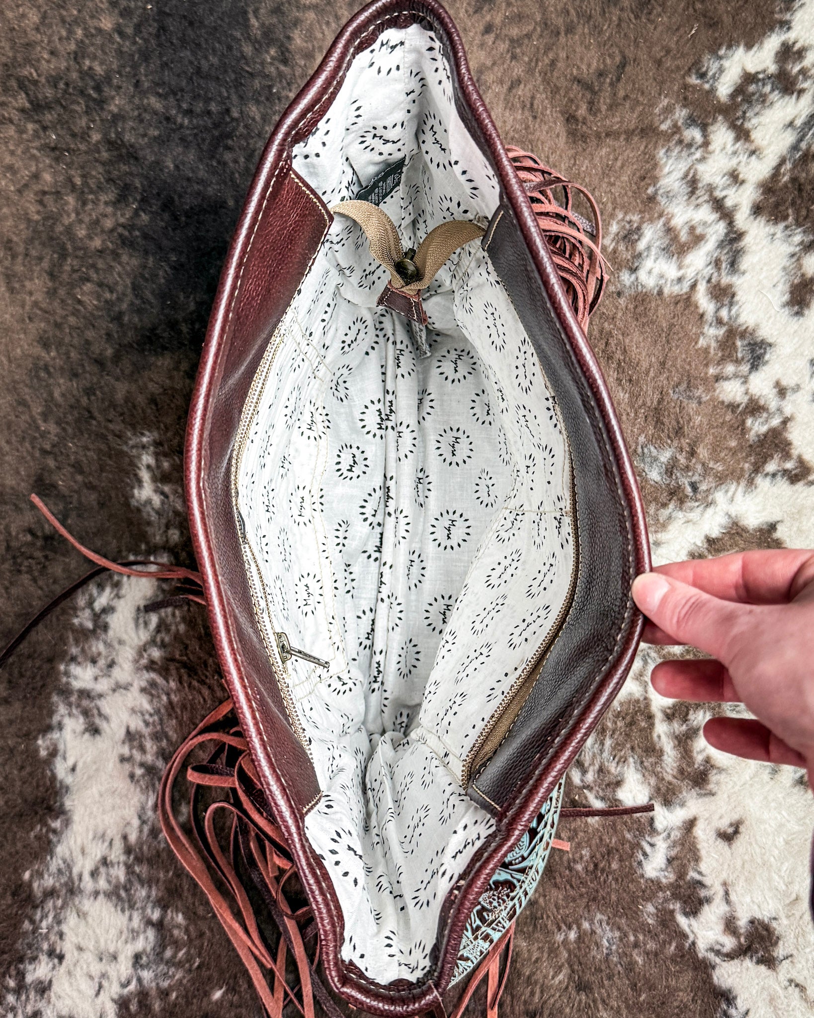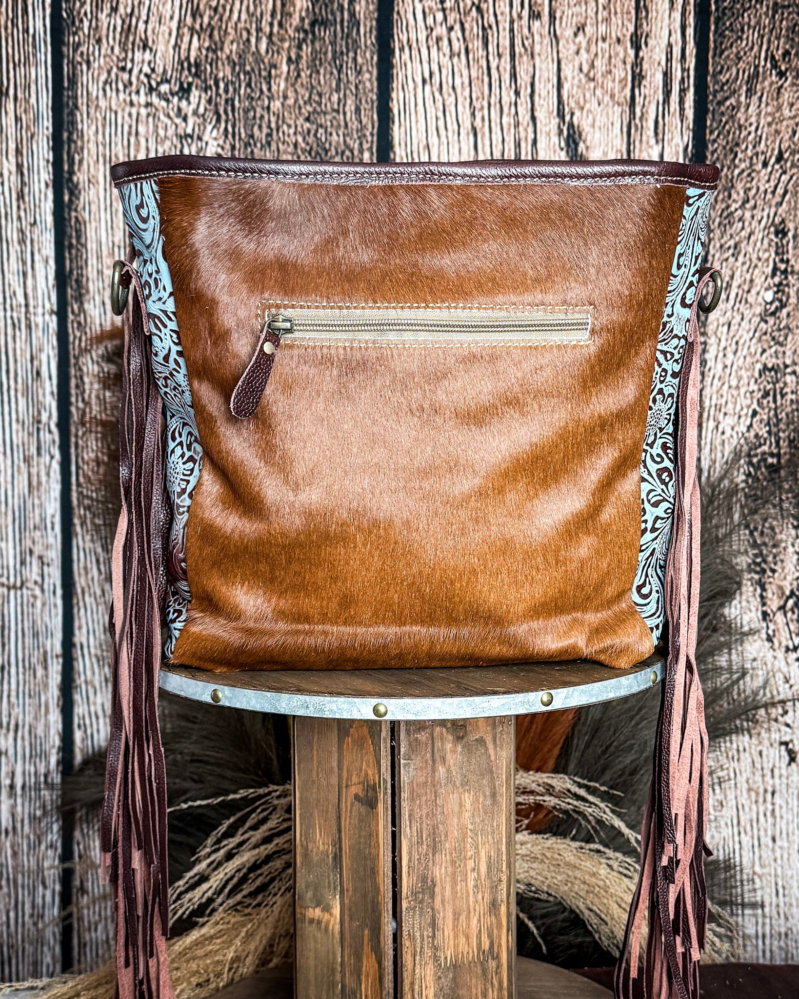 • If you love a bag that brings a little edge and a little color, the Dendrite Hair-On Fringe Crossbody Bag by Myra Bag is such a standout. The rich brown and white hair-on hide pairs perfectly with those turquoise tooled leather panels, giving it that bold western feel with just enough detail to turn heads.