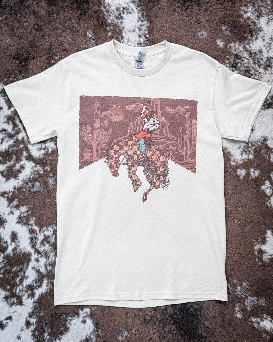 This rhinestone rodeo graphic tee captures the grit and movement of the arena with elevated boutique detail. Set on a warm tan base, the design features a dynamic bucking bronc and rider with layered western pattern accents that give the artwork depth and character. Carefully placed rhinestone embellishments add subtle shimmer, catching the light without overpowering the graphic.