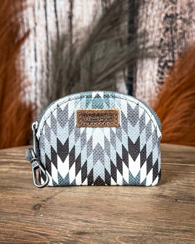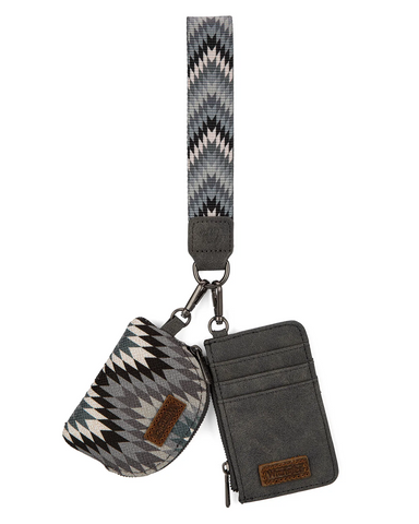 The Desert Sky Wristlet Wallet Set in Gray by Wrangler blends southwestern design with everyday function. Featuring a bold black and gray Aztec pattern paired with rich charcoal faux leather, this three-piece set includes a wrist strap, zip coin pouch, and a matching cardholder β€” perfect for keeping your essentials close at hand.
