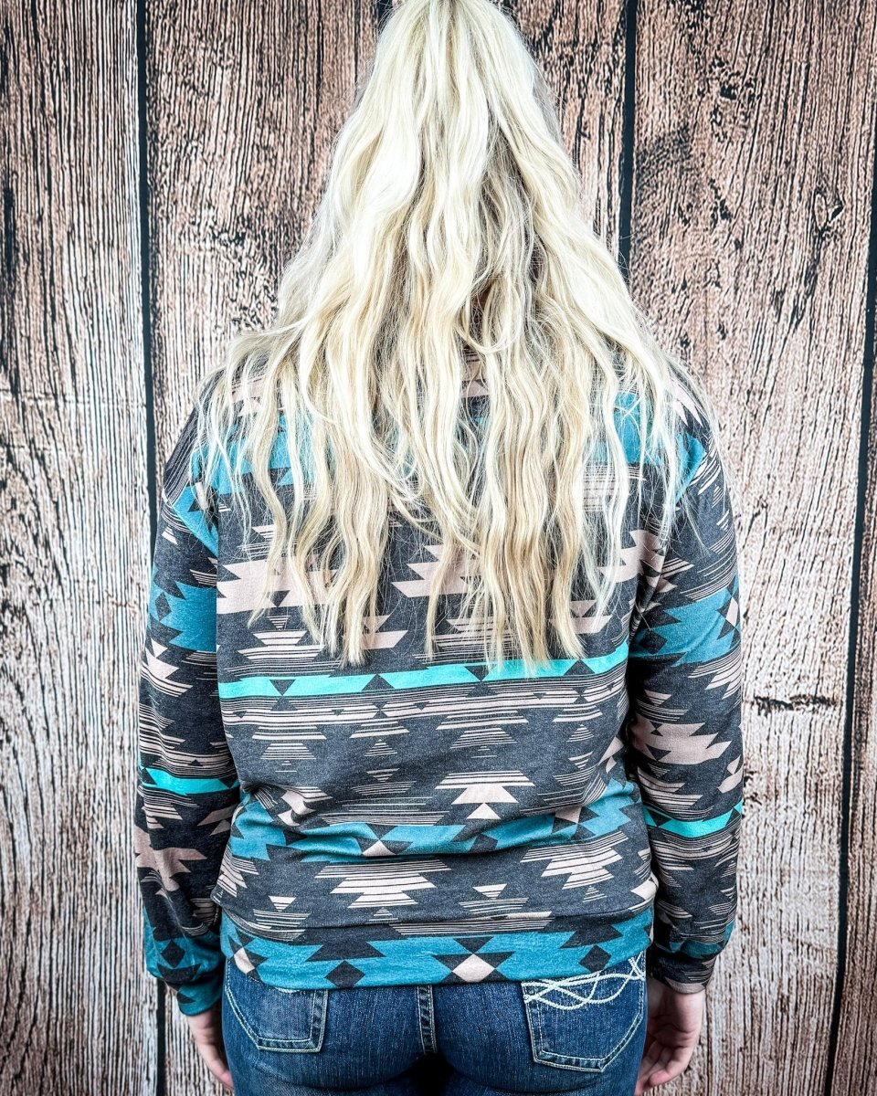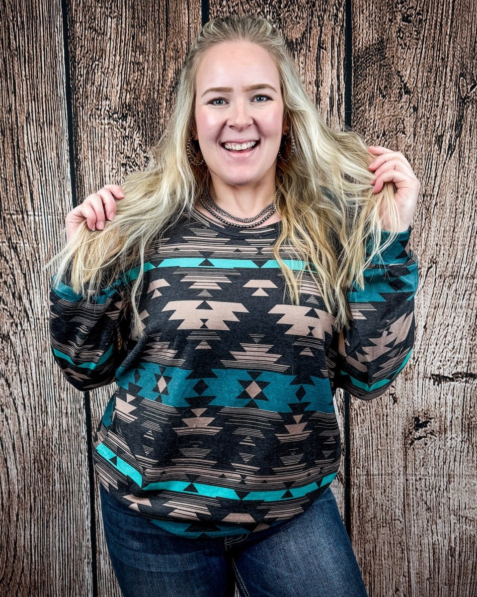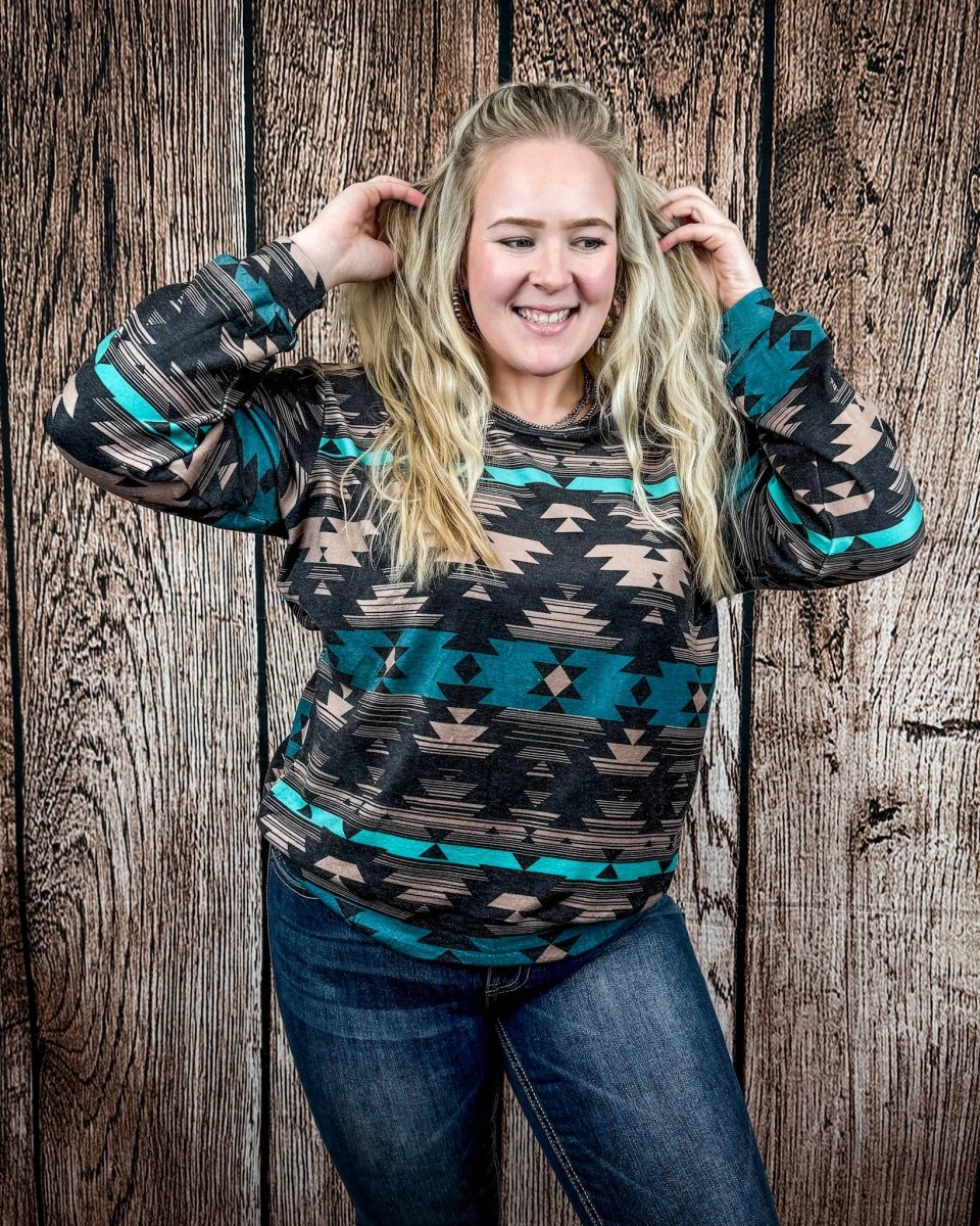 Playfully bold and effortlessly cozy, the Driftwood Dusk Top is your new go-to when you want standout style without sacrificing comfort. Designed with a captivating Aztec pattern in earthy driftwood brown, warm tan, and vibrant turquoise, this top blends rustic charm with a modern edge. The pattern pops against the dark background, making it a striking piece that layers easily or stands strong on its own.