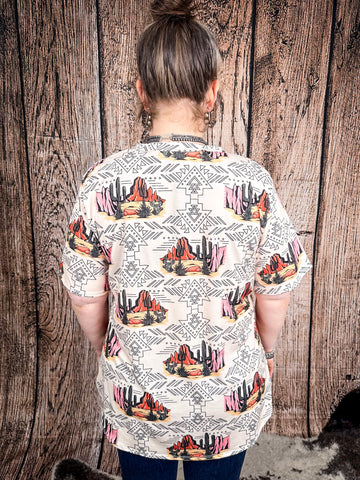 But what really makes this piece stand out is the desert-inspired print that feels straight out of a roadside daydream. With rugged rock formations, towering cacti, and dusky skies painted in warm tones of rust, blush, and sage, it captures the spirit of the Southwest in a way that’s both bold and wearable. Layered atop a subtle geometric background with hints of tribal influence, it’s the kind of design that tells a story — one of open roads, soft winds, and freedom in every direction.