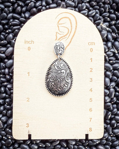 The lightweight silver-tone metal is etched with swirling floral patterns reminiscent of tooled leather, creating a dynamic, high-contrast texture that catches the light with every turn. A delicate beaded edge frames the teardrop silhouette, adding extra polish and dimension. Designed to sway gracefully as you move, these earrings strike the perfect balance between standout and sophisticated.