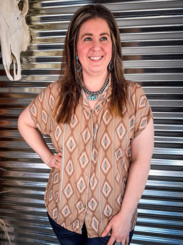 A little rugged, a little refined—the Josie Khaki Aztec Dolman Short Sleeve Button Down Top is Western charm wrapped in effortless style. With its earthy khaki base and a striking dusty blue and rust Aztec print, this top is made for the free-spirited cowgirl who loves timeless style with a touch of adventure.