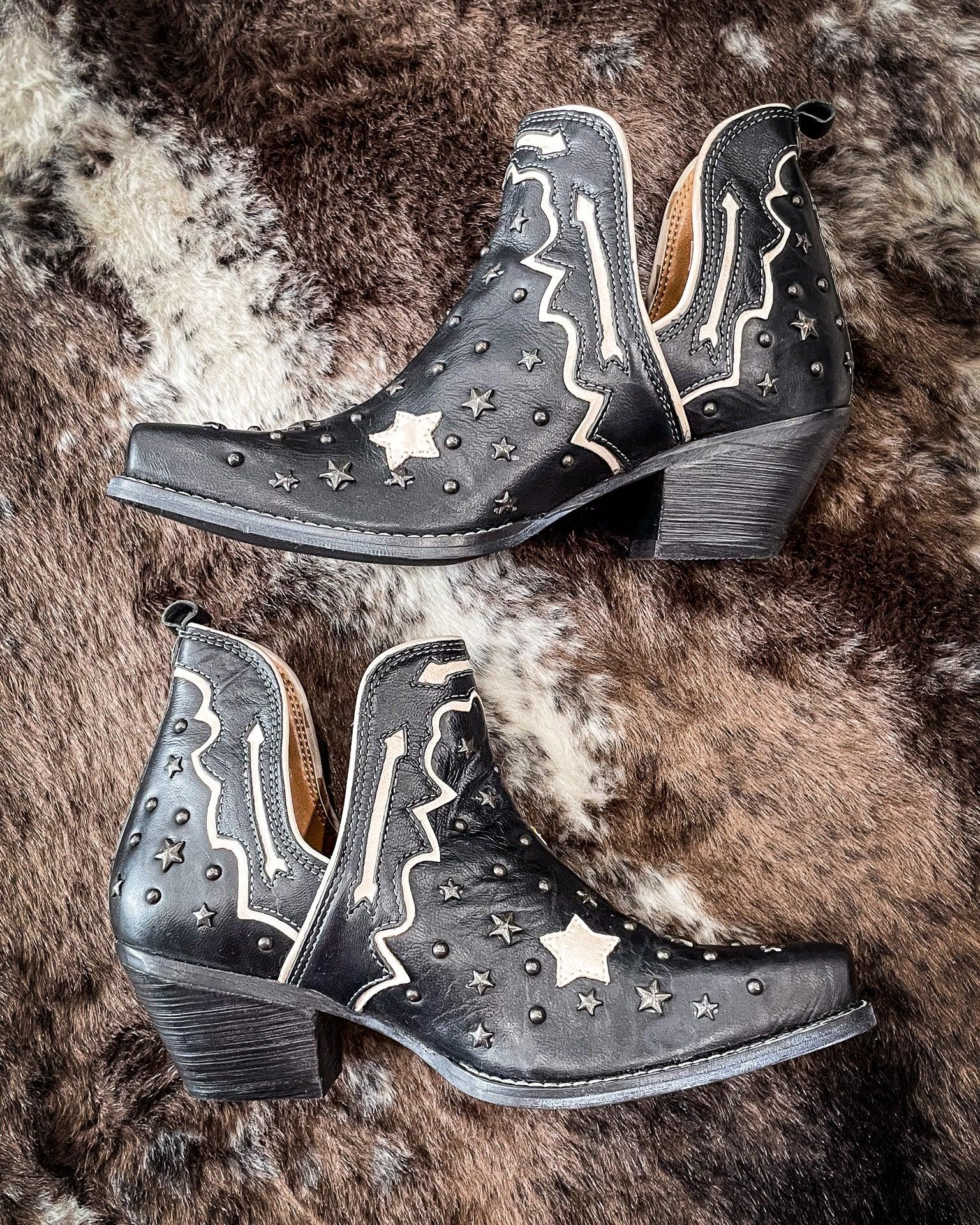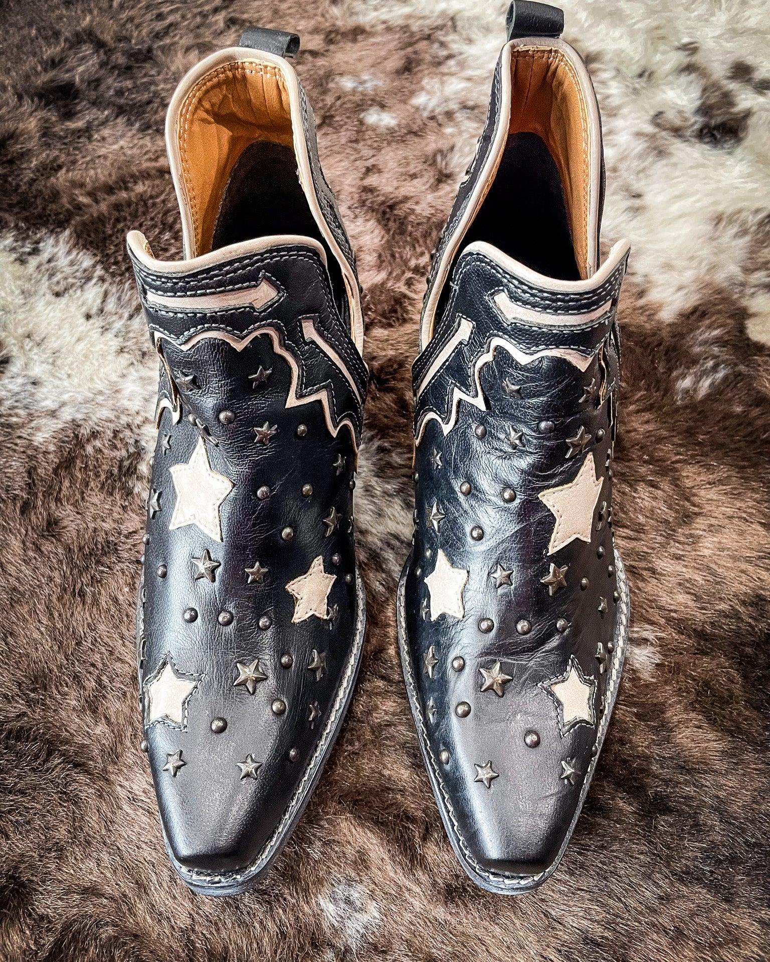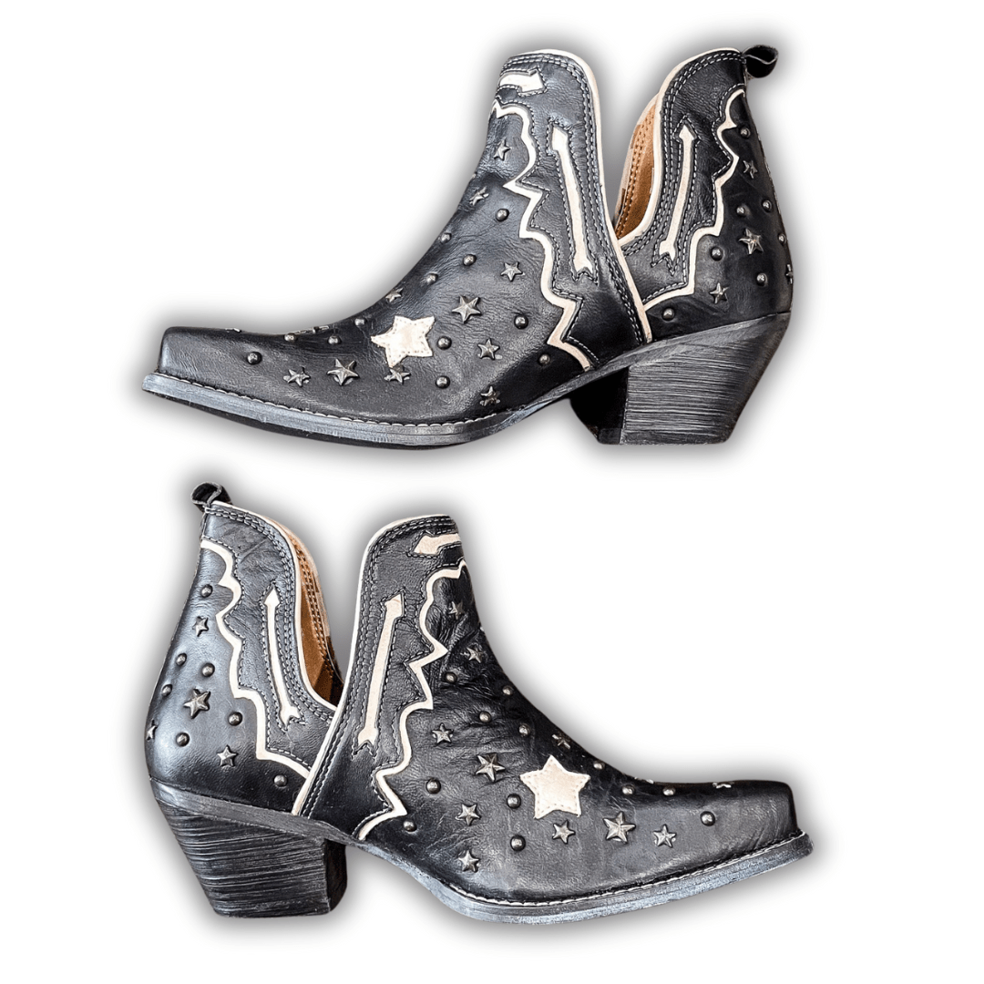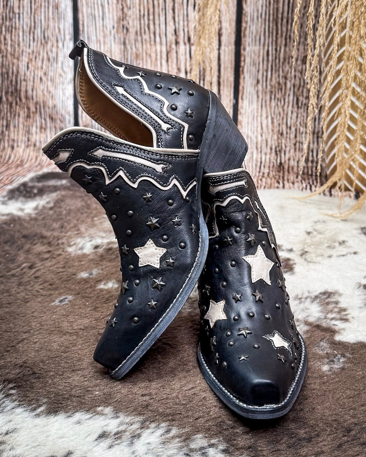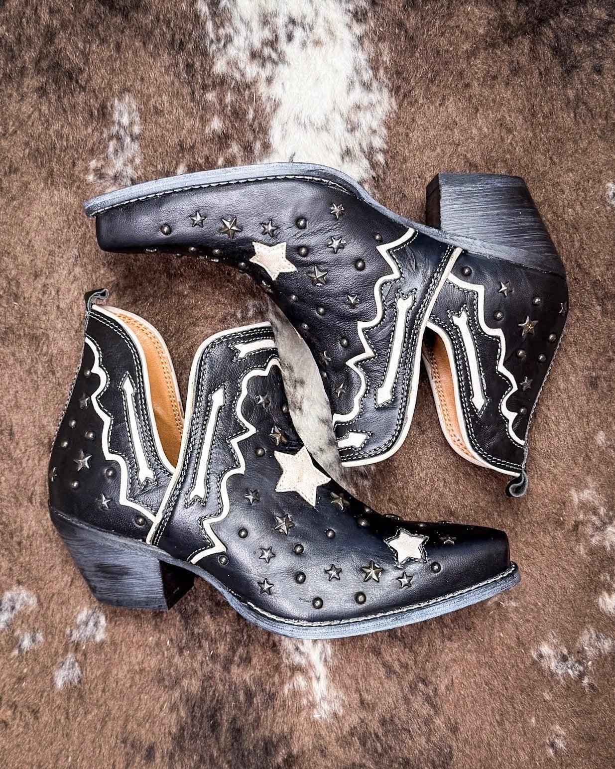 Let your Western style shoot for the stars with the Myra Bag – Lone Star Sky Split-Top Leather Boots. These bold, black boots are the perfect fusion of cosmic cowgirl attitude and handcrafted edge—ready to elevate your look whether you’re headed to a honky-tonk or just stepping out in style.