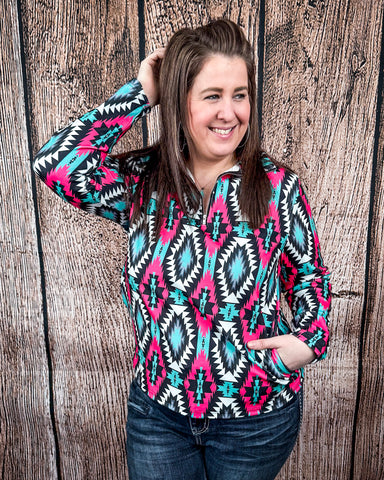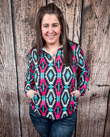 Stand out in bold comfort with the Montezuma Quarter Zip Pullover, a vibrant layering piece made for chilly mornings and laid-back days. Designed with a striking geometric pattern in turquoise, fuchsia, black, and white, this pullover brings a fresh pop of color to every outfit.