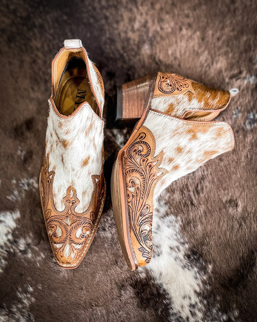 But let’s talk about what really sets the Horse Jane apart: that dreamy combo of hair-on-hide and hand-tooled leather. It’s a striking contrast in textures that feels just as luxe as it looks. The craftsmanship shines through with every detail—and since these are genuine hide, each pair is completely unique. Some may be more spotted, some more solid, some lighter or darker. It all depends on the hide, and that’s part of the charm. We make no guarantees on exact color or pattern—you may or may not receive the exact version pictured, but you will get a boot that’s totally one-of-a-kind.