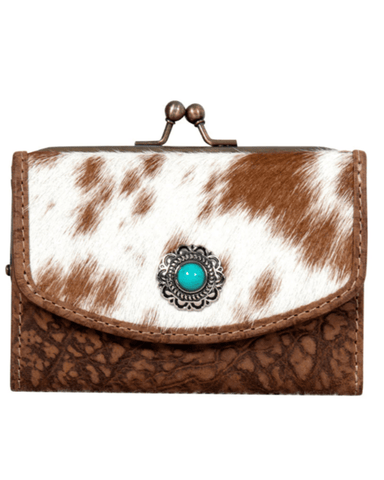 Adding a classic Western touch, a silver concho adorned with a faux turquoise center sits proudly on the flap. This eye-catching embellishment not only complements the hide’s earthy tones but also nods to traditional Southwestern design, bringing a subtle pop of color and an authentic finish. The flap curves gently, secured with a magnetic snap for easy access while maintaining a secure closure.